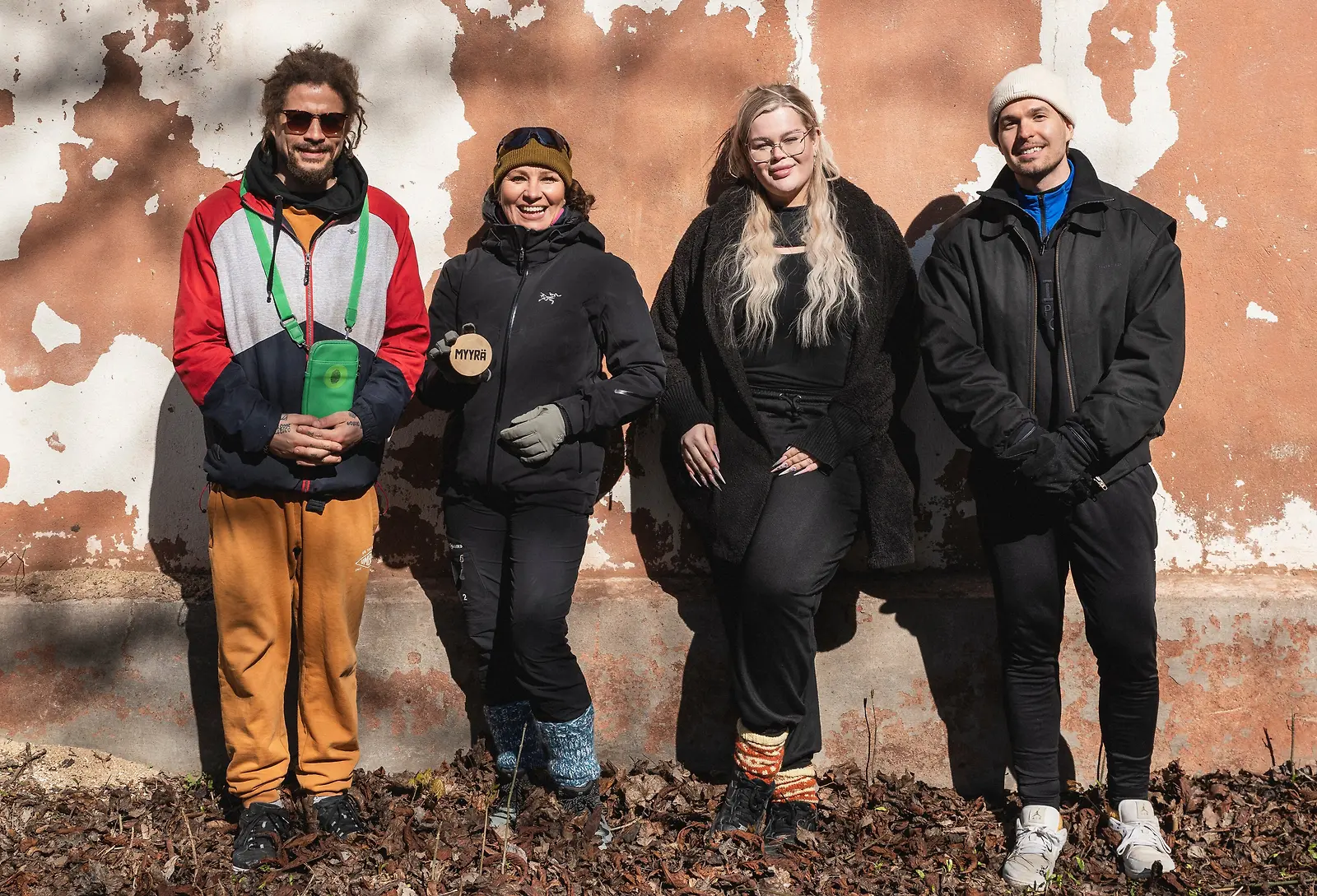 Henny Harjusola sekä Jon ”Juno” Korhonen, Arja Koriseva ja Tomas Grekov Myyrä-kuvauksissa. Kuva: MTV3
