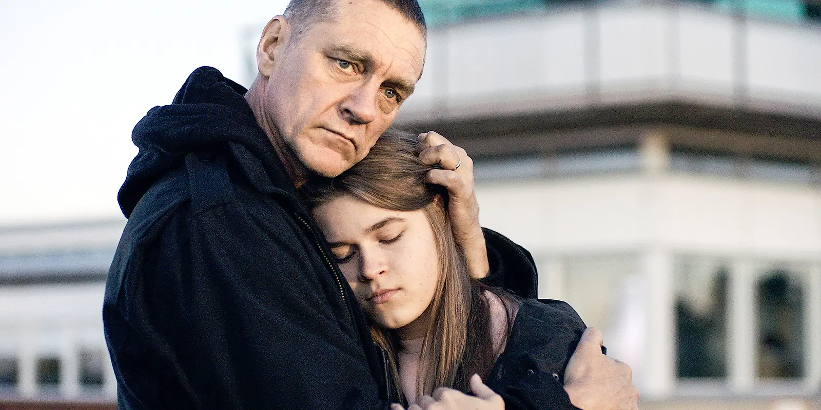 Janina (Olivia Ainali) käy tv-sarjassa läpi hyviä - ja vähän huonompiakin aikoja. Tässä Janina Kari-isän (Ville Virtanen) halauksessa. Kuva: Yle Kuvapalvelu.