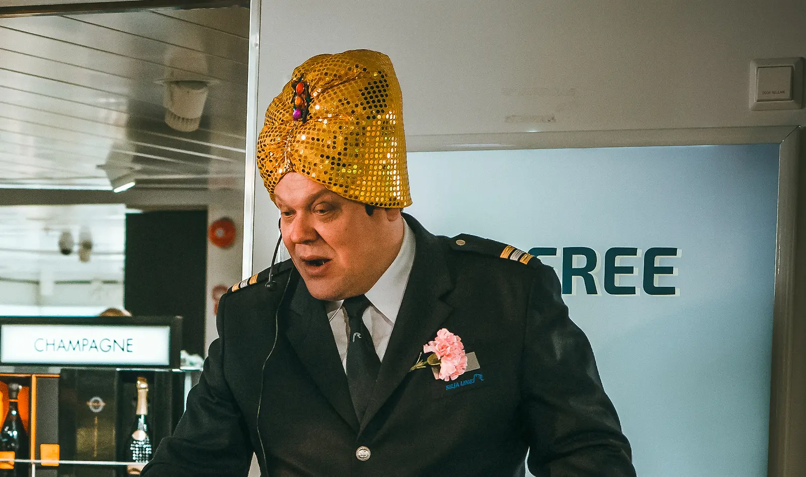 Hannu-Pekka Björkman on pikkutarkka risteilyisäntä Jokke. Jokke palaa isyyslomaltaan laivalle oikomaan asiat, jotka on jälleen kerran hoidettu pieleen. Kuva: Yle Kuvapalvelu.