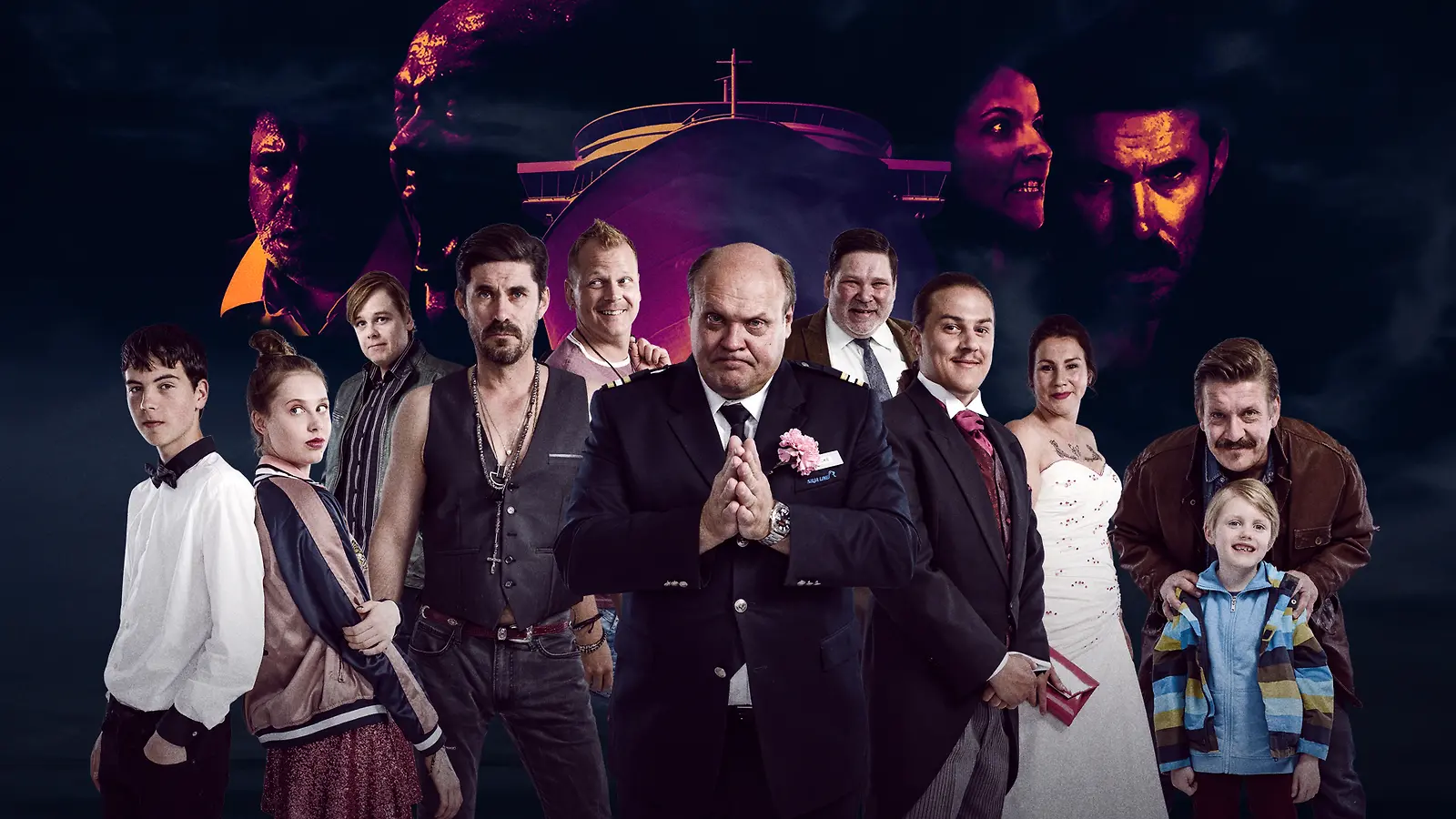 Ruotsinristeilyn asiakaskunnalle sattuu, kun tapahtuu. Itseoikeutettu risteilyisäntä Jokke (Hannu-Pekka Björkman) keskellä. Kuva: Yle Kuvapalvelu