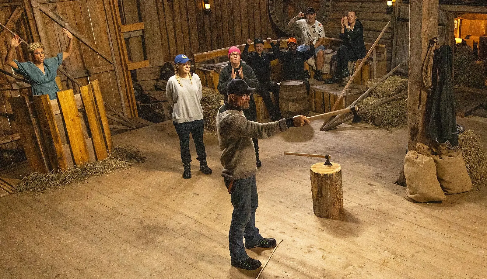 Veeti Kallio keskittyi täysillä ja oli aivan omassa maailmassaan kolmintaistelussa, jossa heitettiin kirvestä. Taustalla kilpakumppanit Kirsikka Simberg ja Merja Kyllönen, Farmi-jengiä sekä Susanna Laine. Kuva Alpertti Rieskjärvi, Nelonen