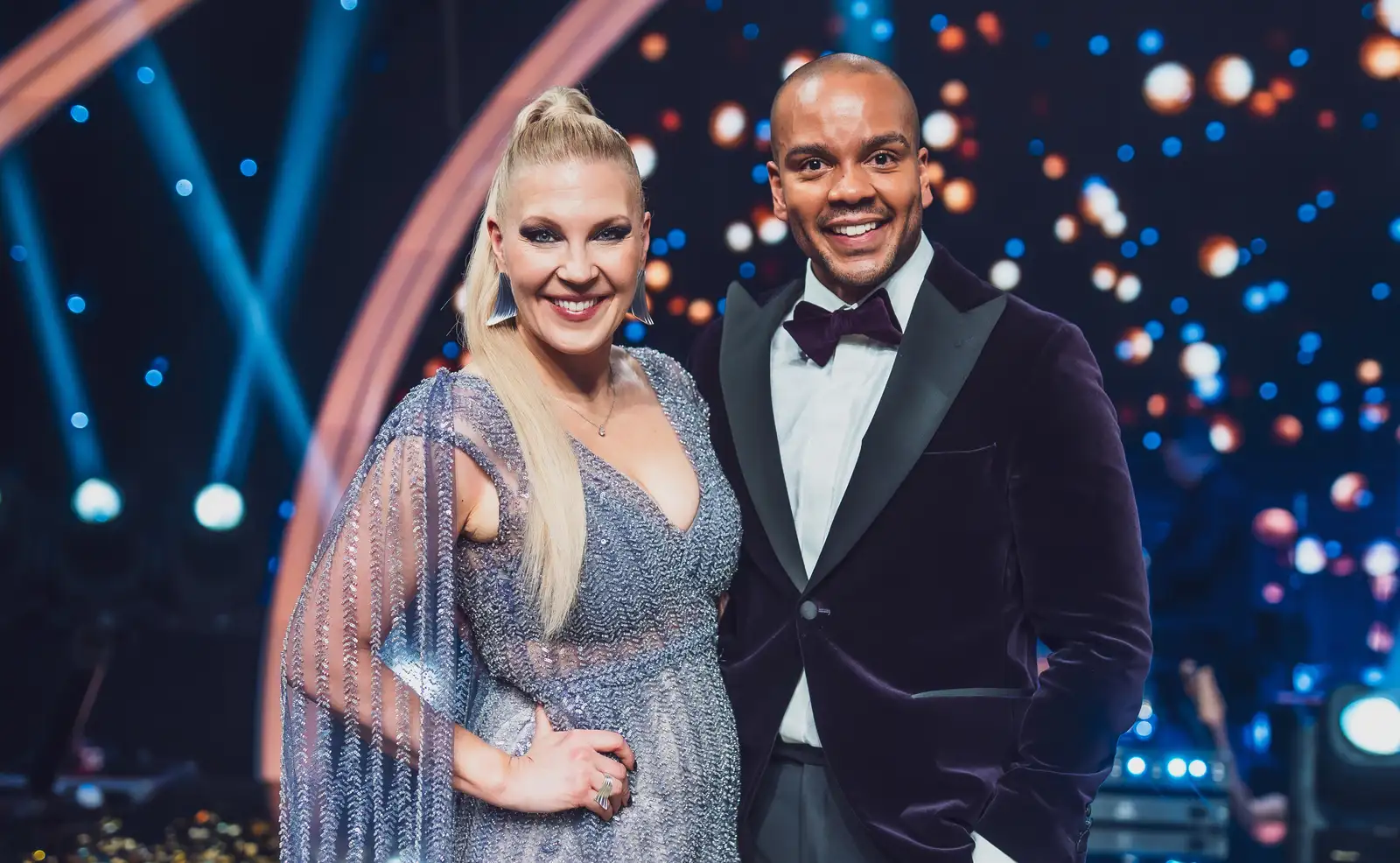 Ernest Lawson ja Vappu Pimiä TTK-juontohommissa. Kausi 2025 jäi Pimiä viimeiseksi ohjelmassa. Kuva: MTV3