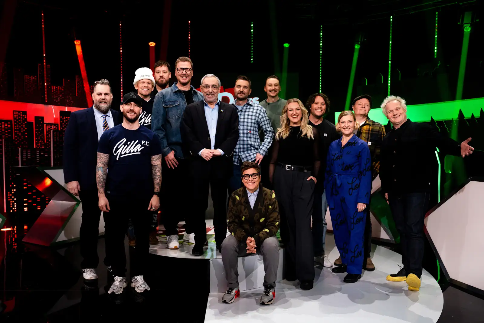 Stadin joukkueet Marxin veljekset (Stan Saanila, Silvia Modig; Ben Zyskowicz), Gilla FC (Jason Nikkinen, Max Blomfelt, Niko Nousiainen. Landen joukkueet PPP (Jenni Poikelus, Mika Parikka, Jere Pehkonen), Itä-Suomen apinat (Pirjo Lonka, Kari Hietalahti, Jani Halme). Kuva: MTV3