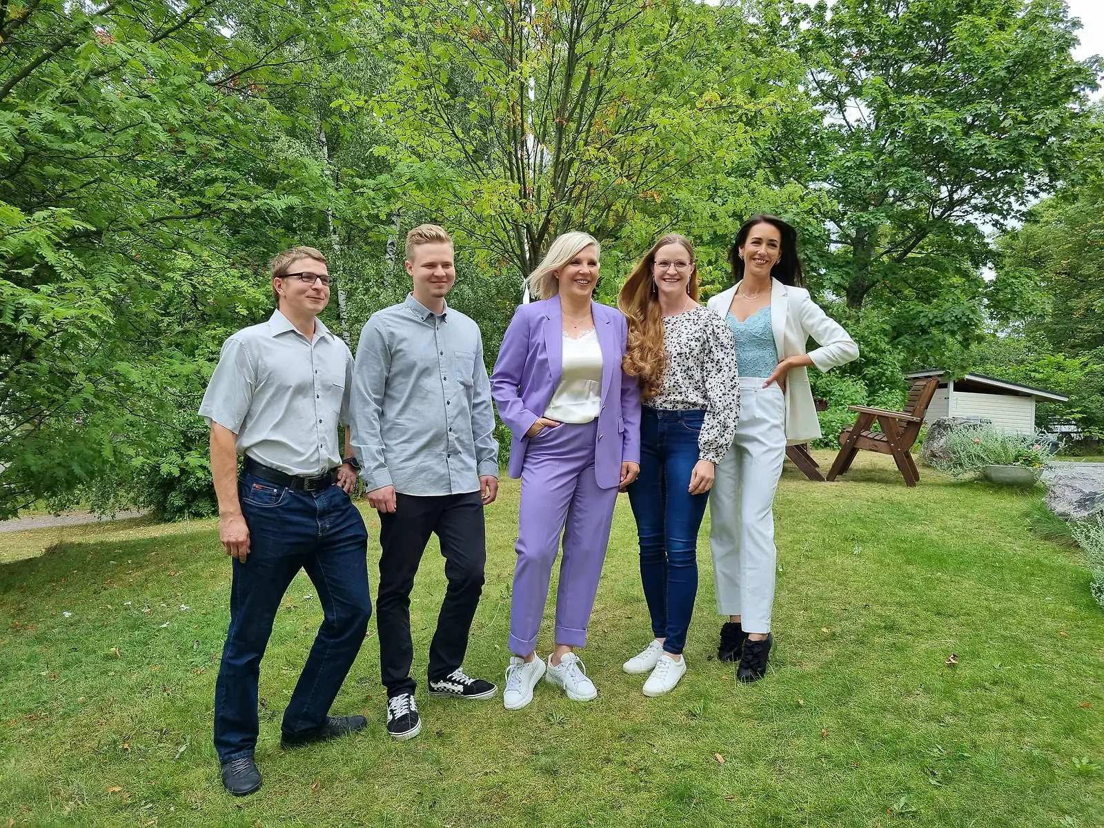 Nämä neljä sinkkua etsivät rakkautta Maajussille morsian ohjelmassa: Arho, Joonas, Anna-Reetta ja Victoria, keskellä Vappu Pimiä. Kuva: K. Kurki