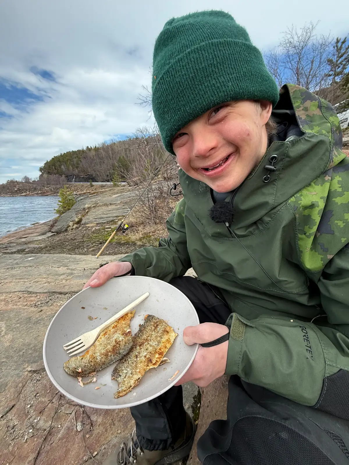 Elämänsä ensimmäisellä kunnon kalareissulla Osmo nappasi upean meritaimenen. Pojan hymy kertoo kaiken. Kuva: Sami Jumppanen / Yle