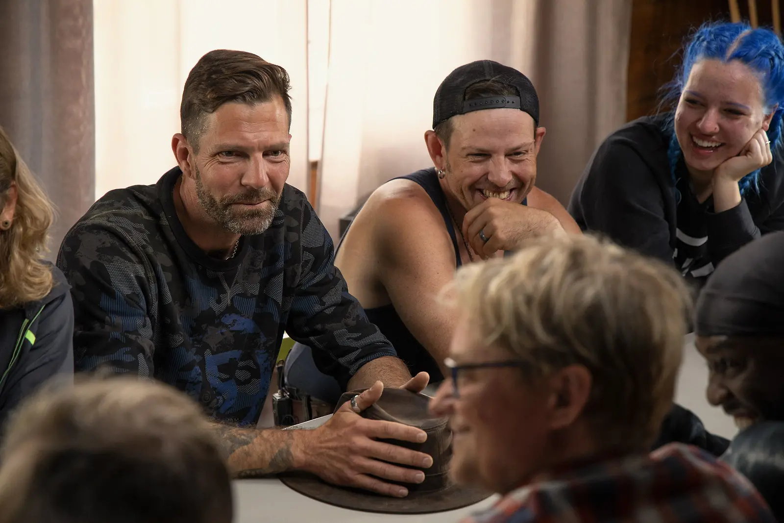 Janne Ahonen, Timo Lavikainen ja Tuuli kisan alkumetreillä nauravaisissa tunnelmissa tuvan pöydän ääressä. Kuva: Nelonen