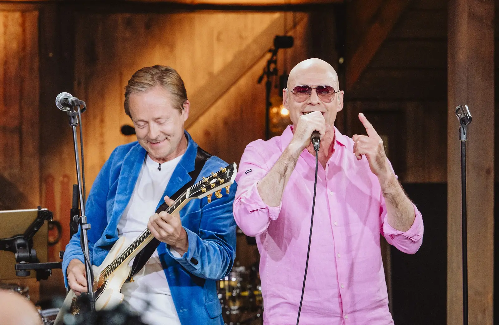 Jussi Rainio kutsui Neon 2 -bändikaverin Rami Alangon lauteille Einin päivänä ja he vetivät Sulle tuli faksi -biisin. Kuva: Nelonen