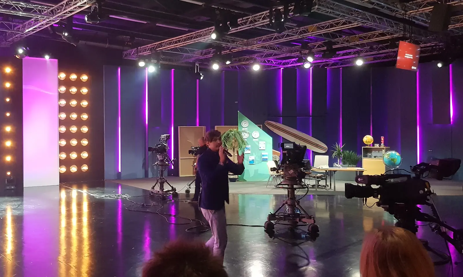 Salminen harppoo pitkin studion lavasteita ja ohjeistaa yleisöä elämään täysin rinnoin mukana.