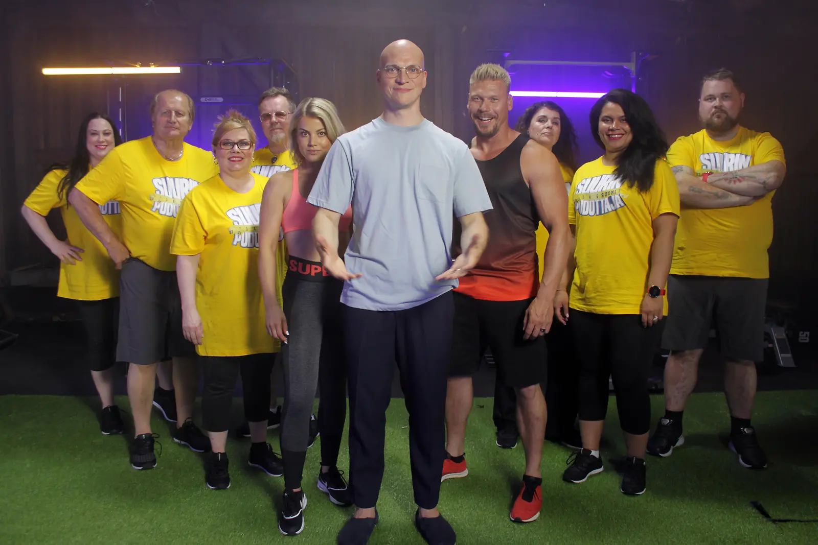 Suurin pudottaja Suomi -sarjassa toisistaan mittaa ottavat julkisuudesta tutut tähdet: vasemmalta Niina Kuhta, Juhani Tamminen, Nina Mikkonen, Pertti Neumann, Riitta Väisänen, Michele Murphy-Kaulanen ja Akseli Herlevi. Edessä valmentajat Janni Hussi ja Aki Manninen sekä juontaja Riku Nieminen. Kuva: Nelonen