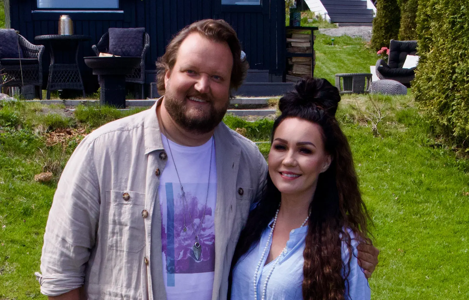 Sami Hedberg ja Saija Tuupanen omilla tiluksillaan vihreällä nurmikolla, takana saunarakennus. Kuva: MTV3.