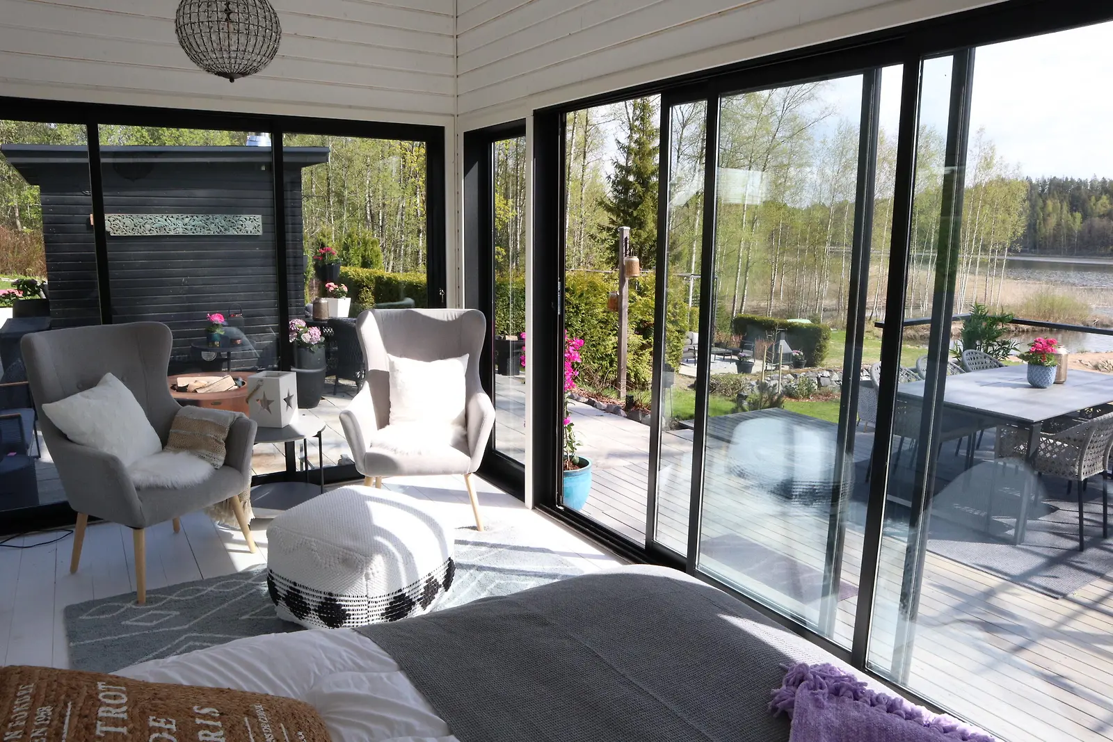 Vierasmökki on pieni, mutta toimiva. Erityismaininta valoisuudesta, toisella seinällä isot ikkunat ja ikkunalliset liukuovet. Kuva: MTV3