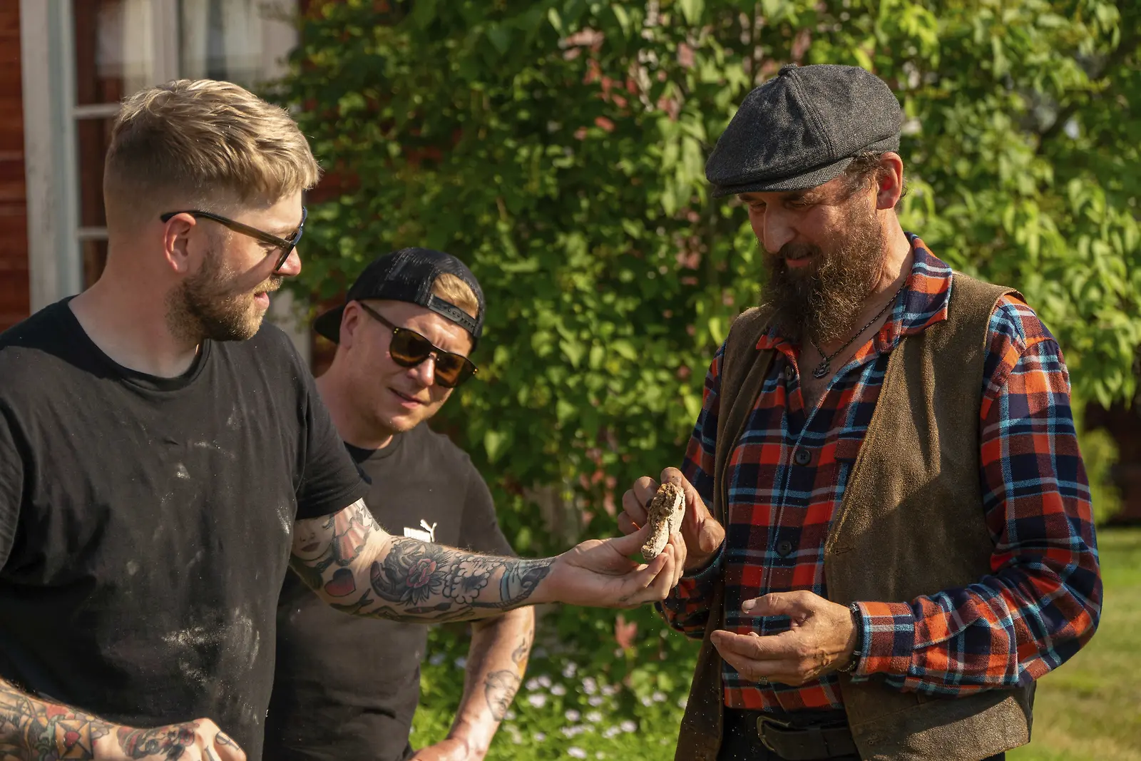 Kyläkauppias Sampo Kaulanen ja kokki Teemu Laurell pehtoorin juttusilla. Kuva Alpertti Rieskjärvi, Nelonen