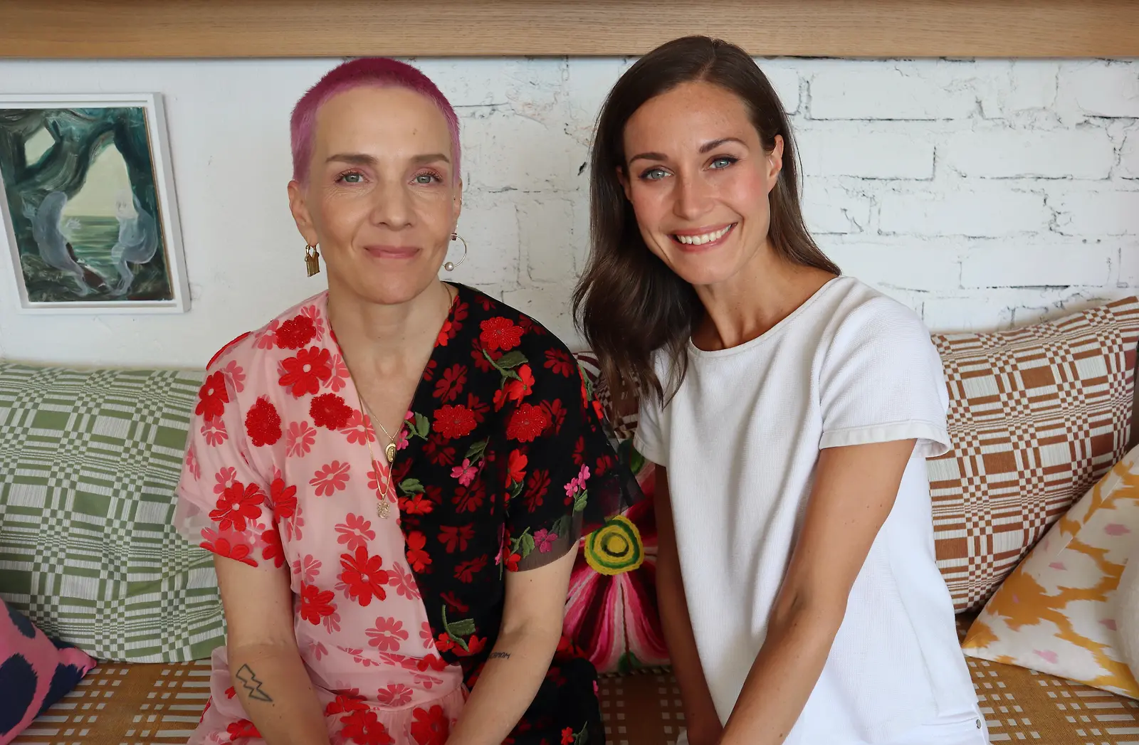 Toimittaja Maria Veitola ja pääministeri Sanna Marin leppoisissa tunnelmissa. Kuva: MTV3