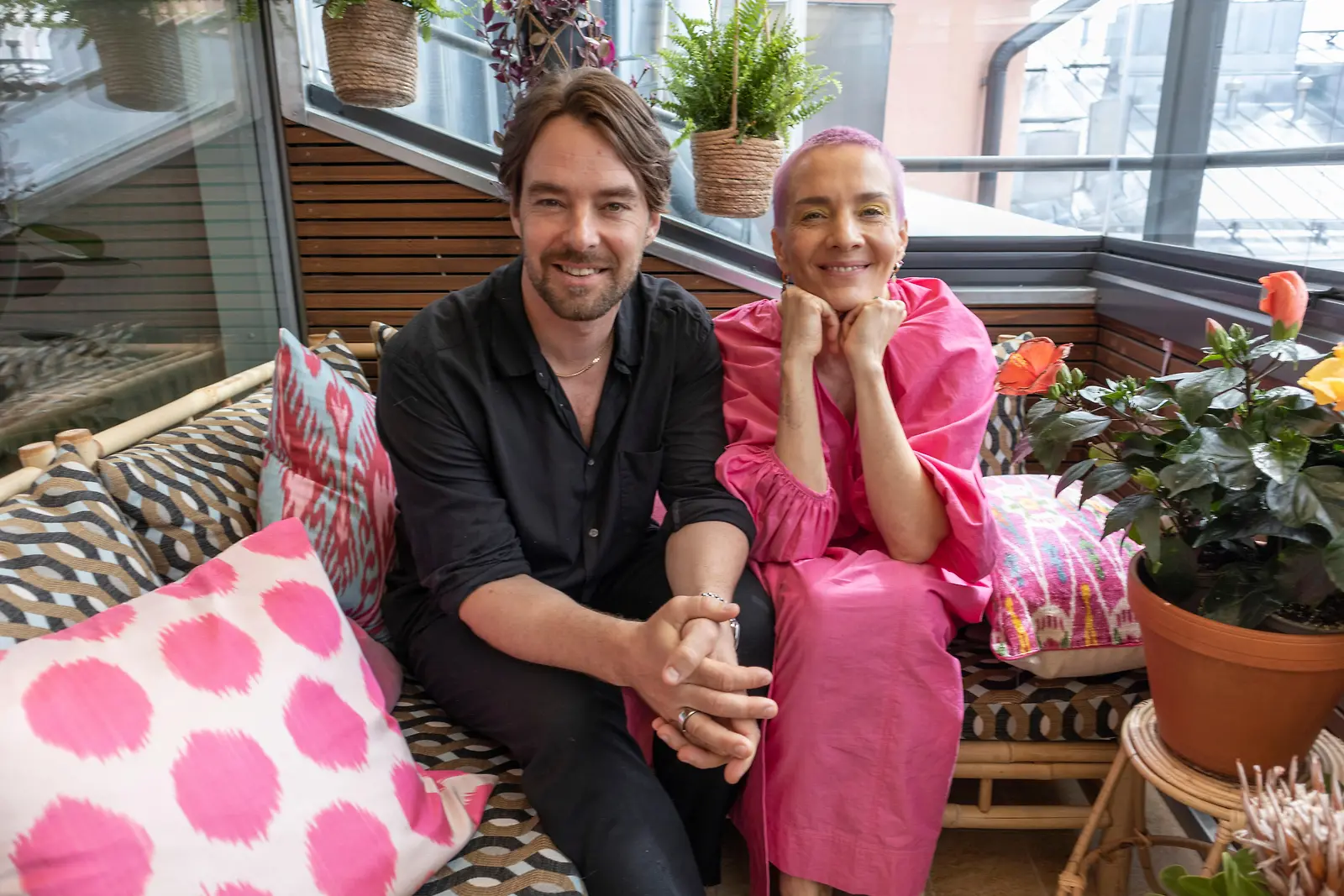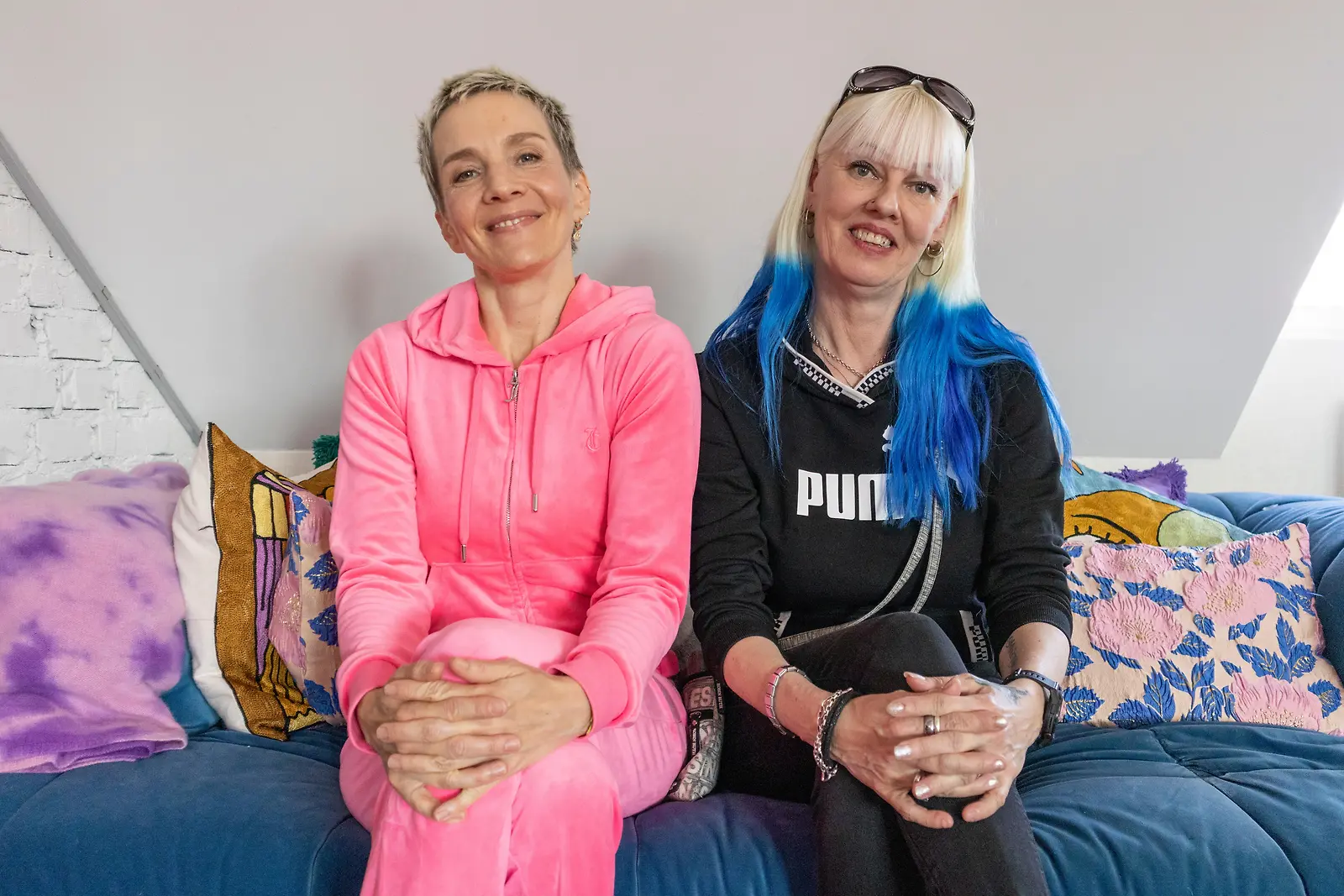 Pääministeri Sanna Marin saapuu vieraaksi Maria Veitolan kotiin. Tässä he istuvat punavuorelaisella sohvalla. Kuva: MTV3