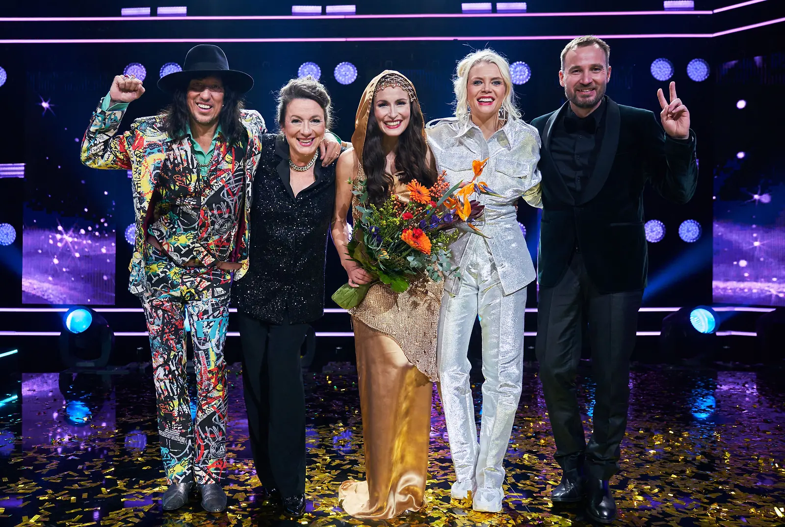 Maria Lund voitti v. 2023 Tähdet, tähdet. Vasemmalta Sami Yaffa, Lilli Paasikivi, Maria Lund, juontaja Susanna Laine ja Juuso Mäkilähde. Kuva: Nelonen
