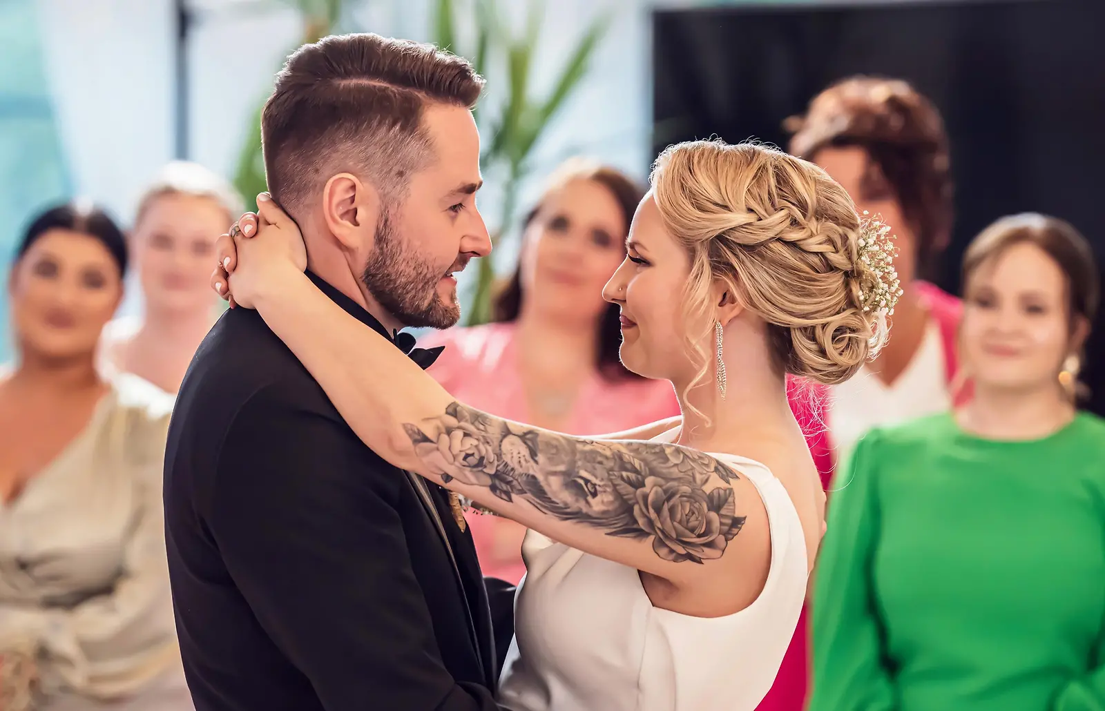 Julia ja Waltteri katsovat toisiinsa intiimisti hääpäivänään tanssilattialla. Kuva: MTV3
