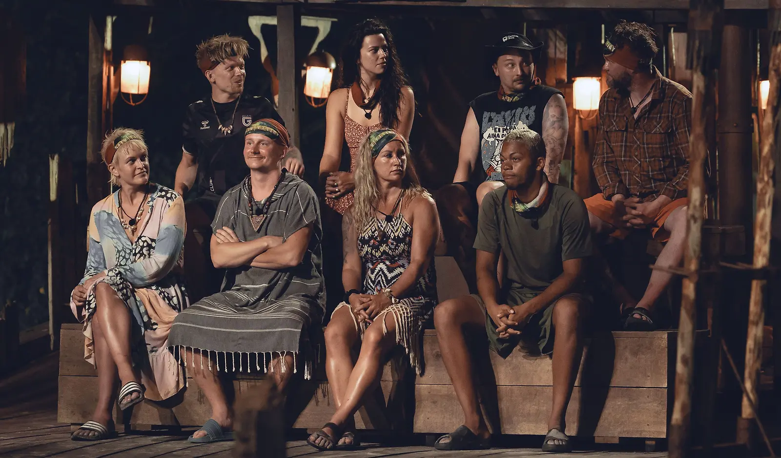 Diarran heimo ja viimeinen heimoneuvosto. Kuvassa alhaalla toinen vasemmalta heimopäällikkö Kristian Heiskari ja alhaalla oikealla Bakari Diarra. Kuva: Nelonen