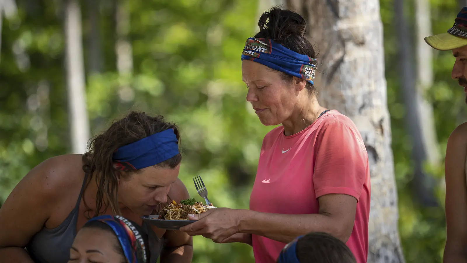 Eija Kantolalle saariruoka ei tuottanut ongelmia. Sanna Pikkarainen nuuhkii Eijan huutokaupassa voittamaa pastalautasellista. Kuva: Nelonen/Lars Johnson