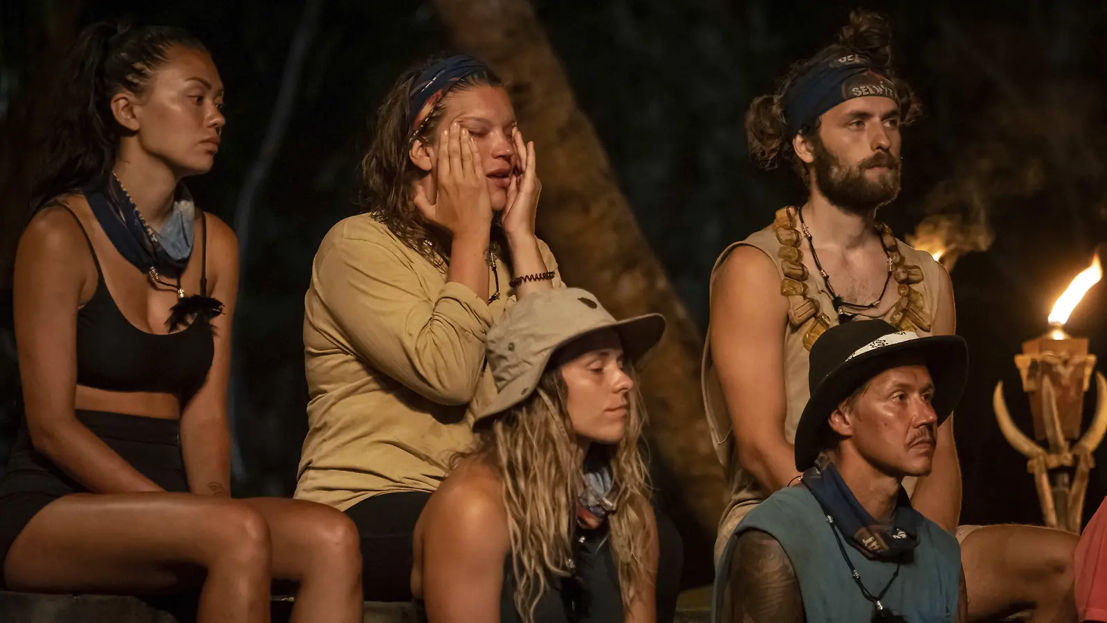 Sanna antoi tunteidensa näkyä Selviytyjät-saarella. Tässä ollaan heimoneuvostossa yhdessä Shirlyn, Paulin, Eveliinan ja Heikin kanssa. Kuva: Nelonen/Lars Johnson