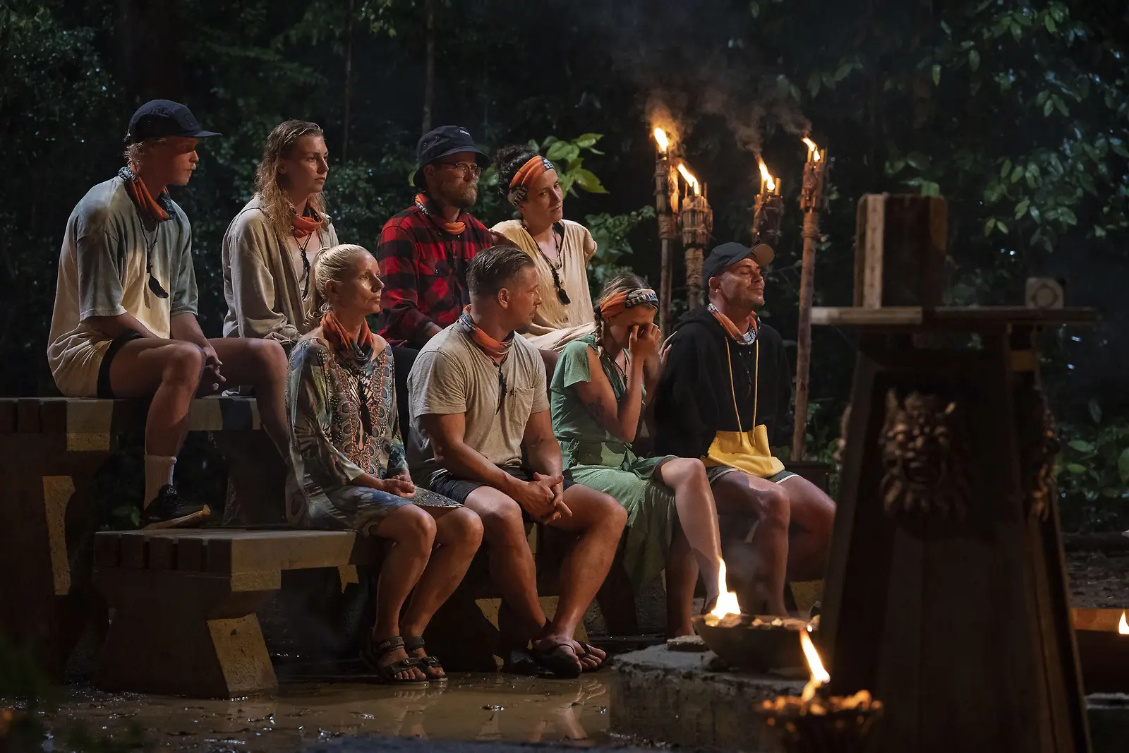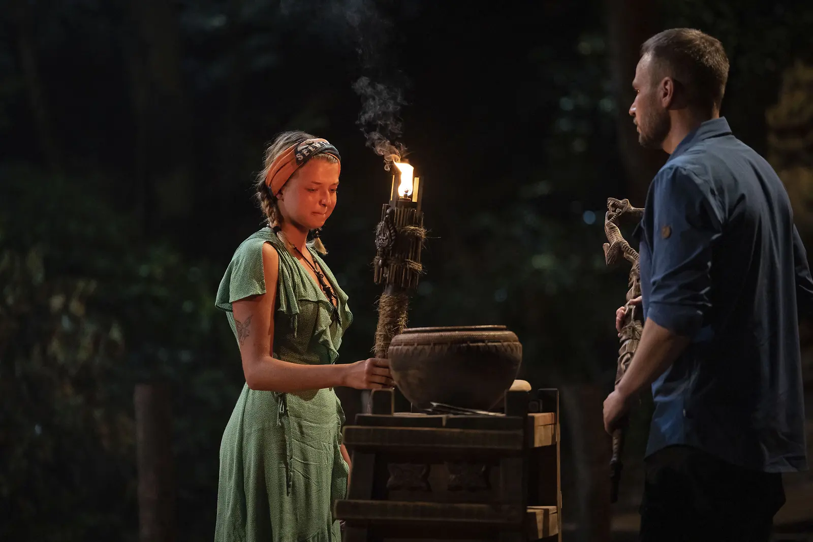 Joalin Loukamaa itkuisena heimoneuvostossa, soihdun sammuttajana Juuso Mäkilähde. Kuva: Lars Johnson, Nelonen