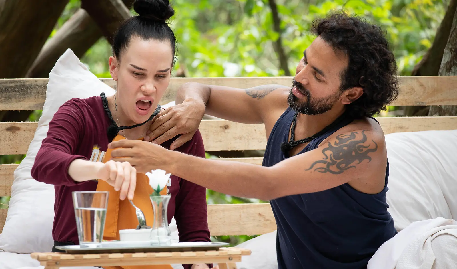 Sini Sabotage joutui useampaan otteeseen epämiellyttävien asioiden syöntitehtäviin. Antonio Flores auttaa. Kuva: MTV3