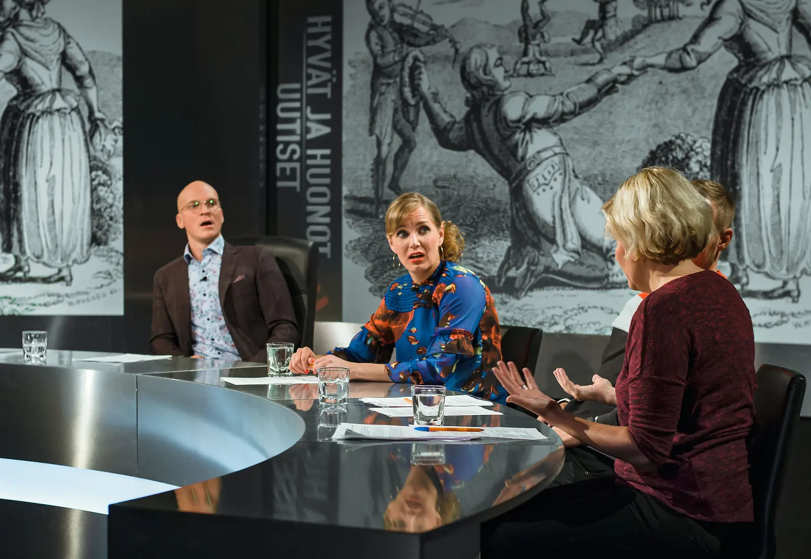 Hyvät ja huonot uutiset vakiojengiä, juontaja Riku Nieminen ja panelistit Niina Lahtinen ja Paula Noronen. Kuva: Nelonen