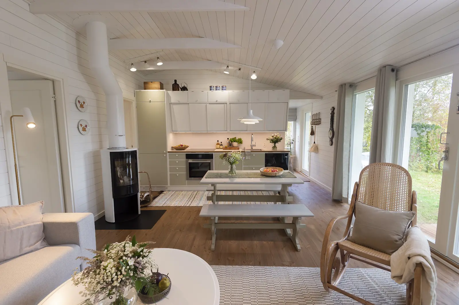 Mökin sisustus muuttui puunvärisestä valkoisen ja beigen sävyihin. Keittiö muuttui toimivaksi tupakeittiöksi. Kuva: Manne Koponen/Nelonen