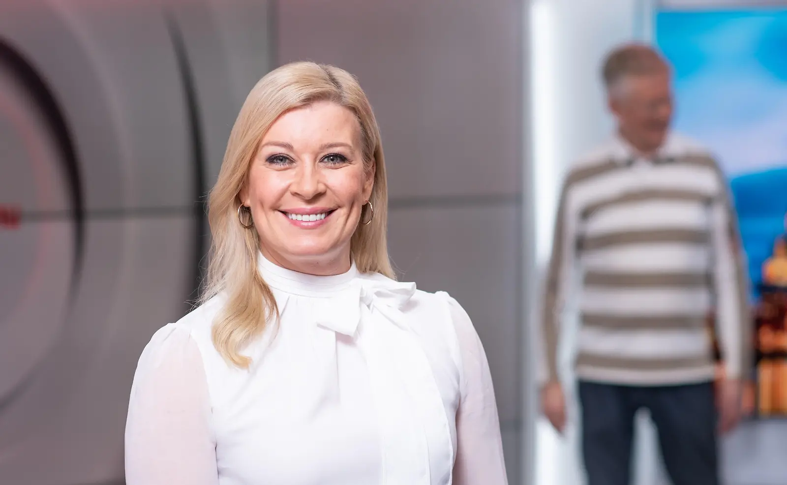 Kirsi Alm-Siira on Maikkarin suosittu uutisankkuri, taustalla kollega Pekka Pouta. Kuva: MTV3