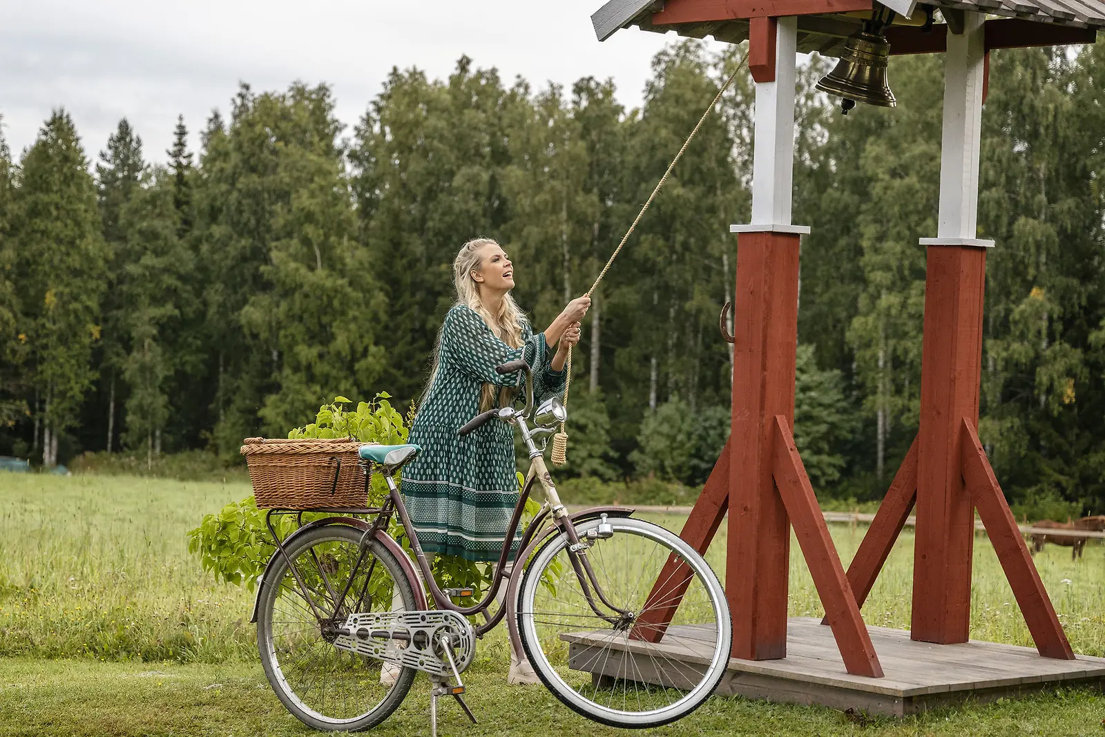 Susanna Laine kilkattamassa kelloa, joka kutsuu farmilaiset yhteen. Kuva Alpertti Rieskjärvi, Nelonen