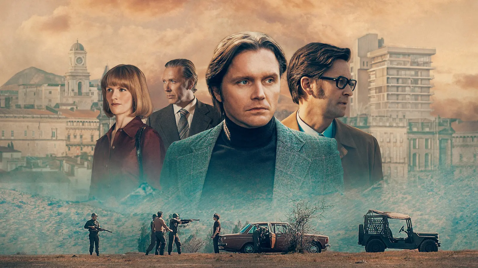 Chilessä kuohunnan keskellä Lysa Brotherus (Sophia Heikkilä), Harald Edelstam (Mikael Persbrandt), Tapani Brotherus (Pelle Heikkilä) ja Ilkka Jaamala (Ilkka Villi). Yle Kuvapalvelu