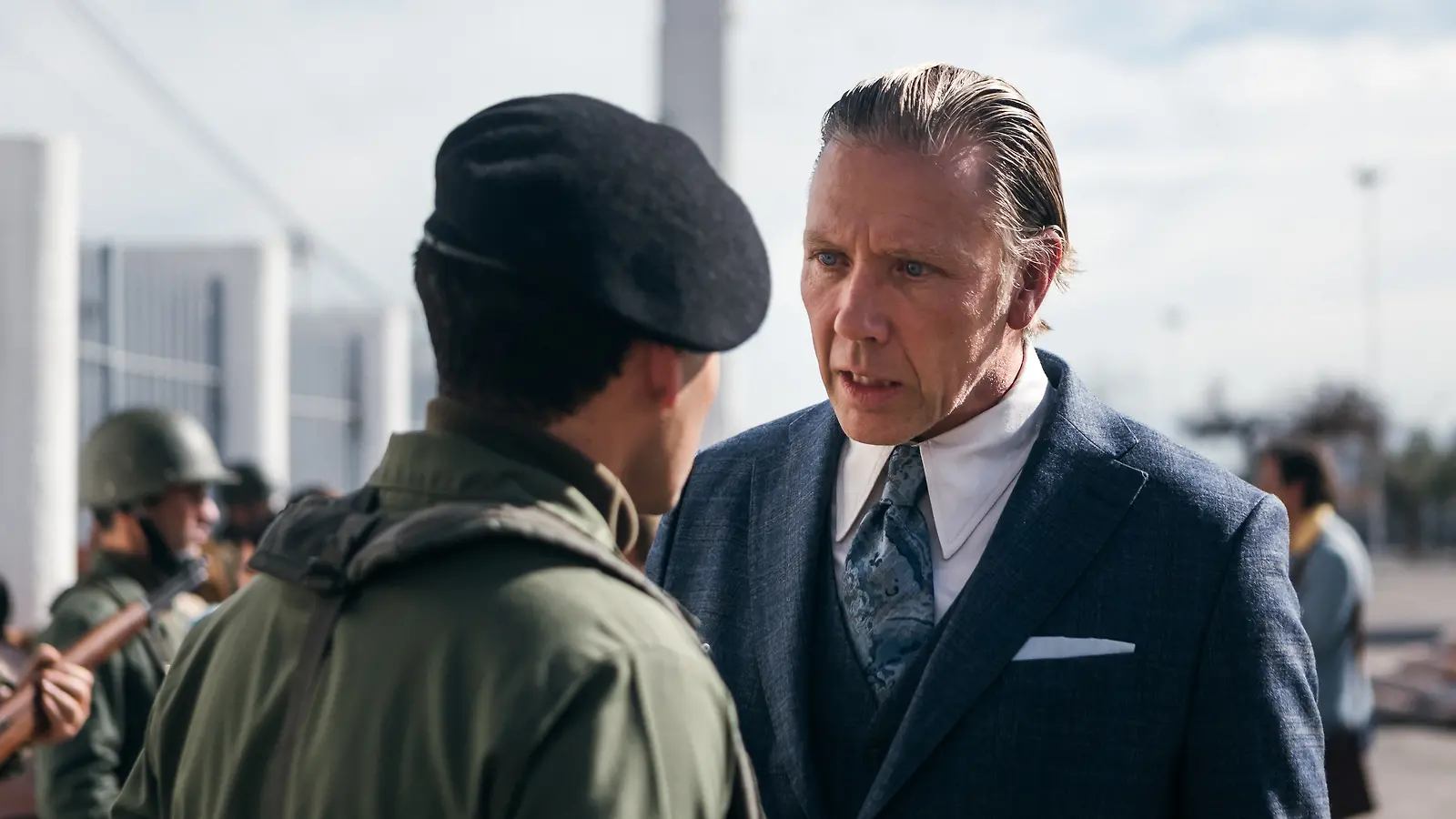 Ruotsalainen diplomaatti Harald Edelstam (Mikael Pernsbrandt) setvimässä sotilaan kanssa. Yle Kuvapalvelu
