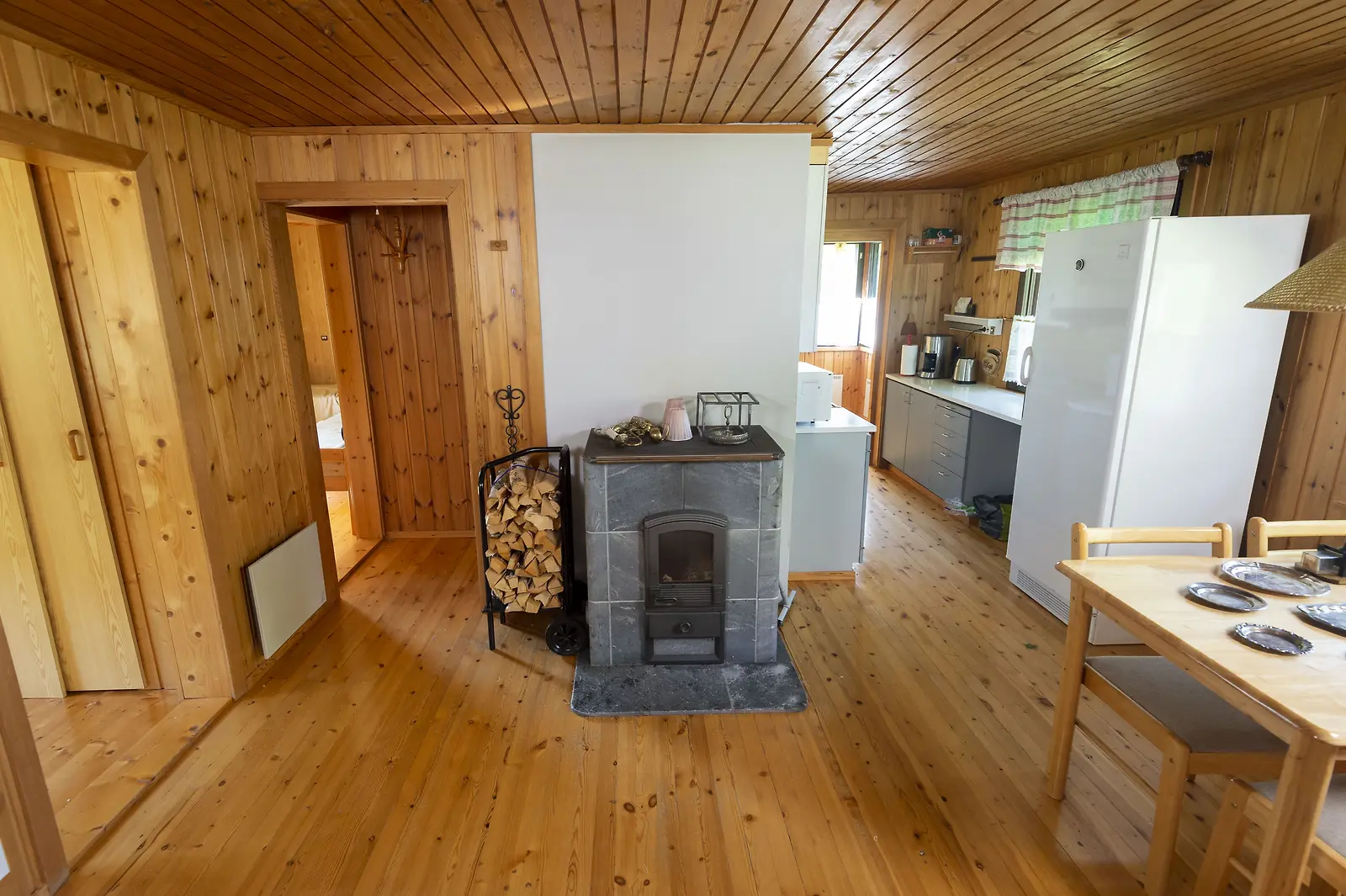 Mökin sisustus muuttuu valkoisen ja beigen sävyihin. Puupaneeli saa kyytiä valkean seinämateriaalin tieltä ja keittiö muuttuu toimivaksi tupakeittiöksi. Kuva: Manne Koponen/Nelonen