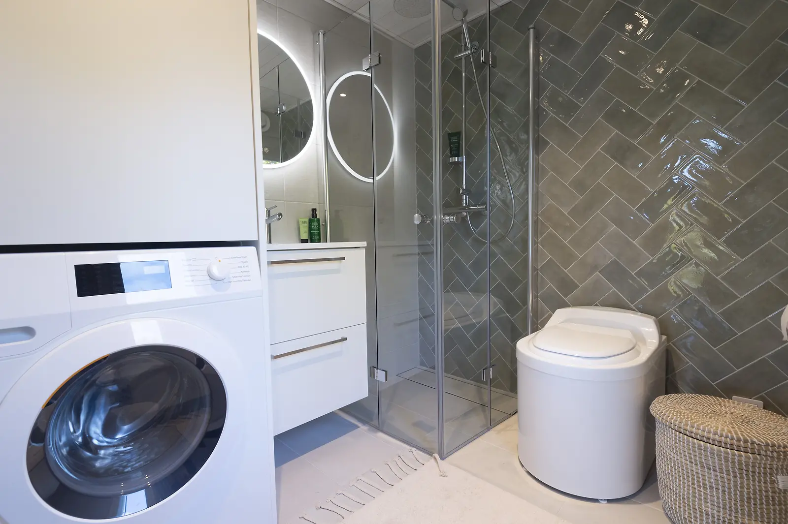 Kylpyhuone on todellista luksustasoa: upea, harmaa kaakeliseinä ja suihkukoppi kruunaavat tilan. Kuva: Manne Koponen/Nelonen