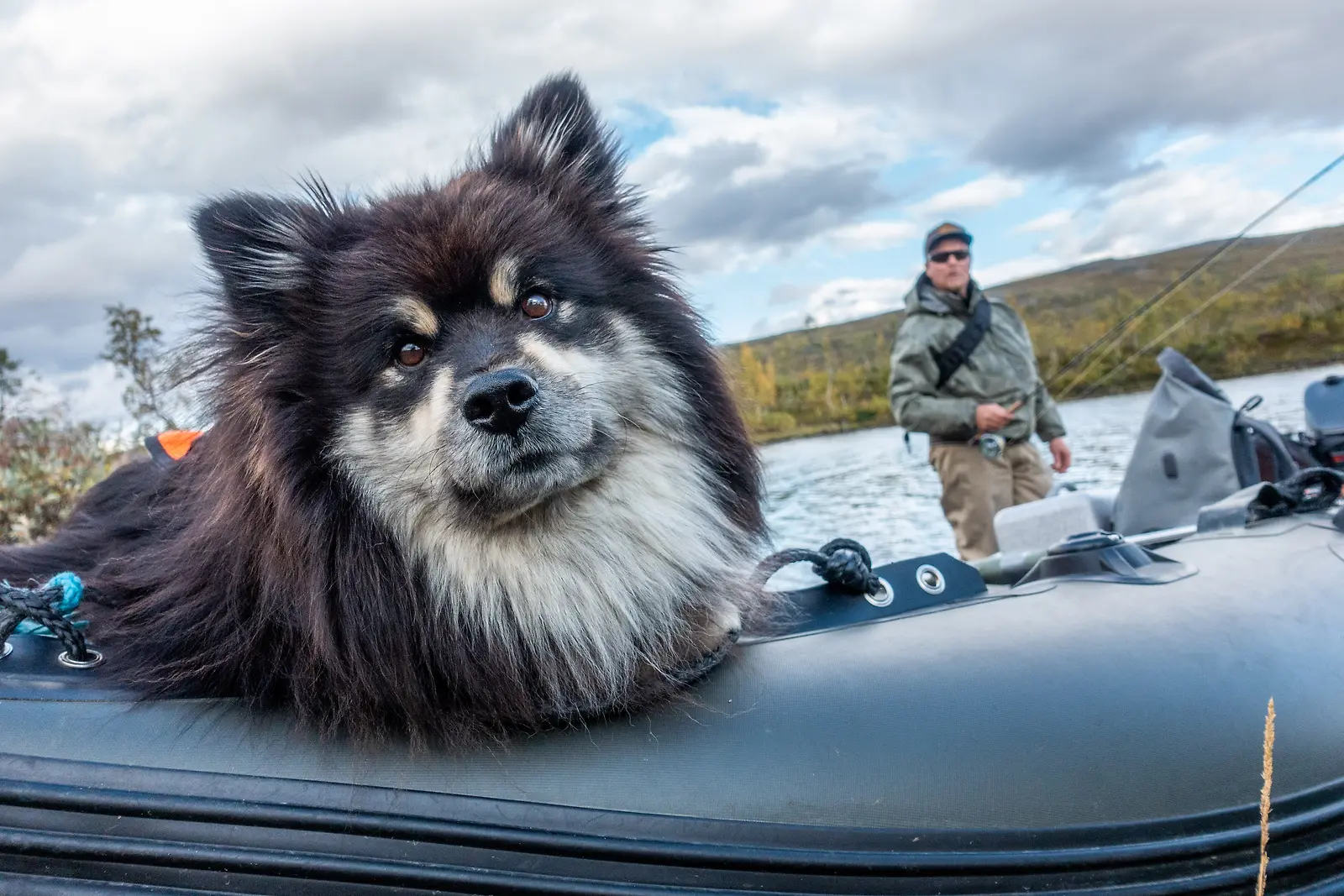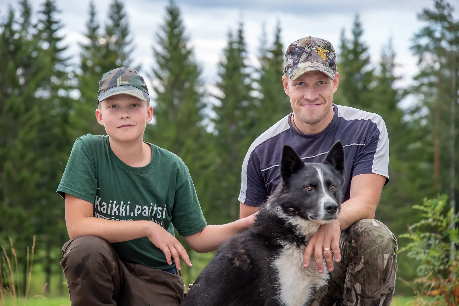 Paavo Lehtomäki, Johannes Lehtomäki ja karjalankarhukoira Riski. --- Jani Honkakoski/NTRNZ media/Yle Yle Kuvapalvelu