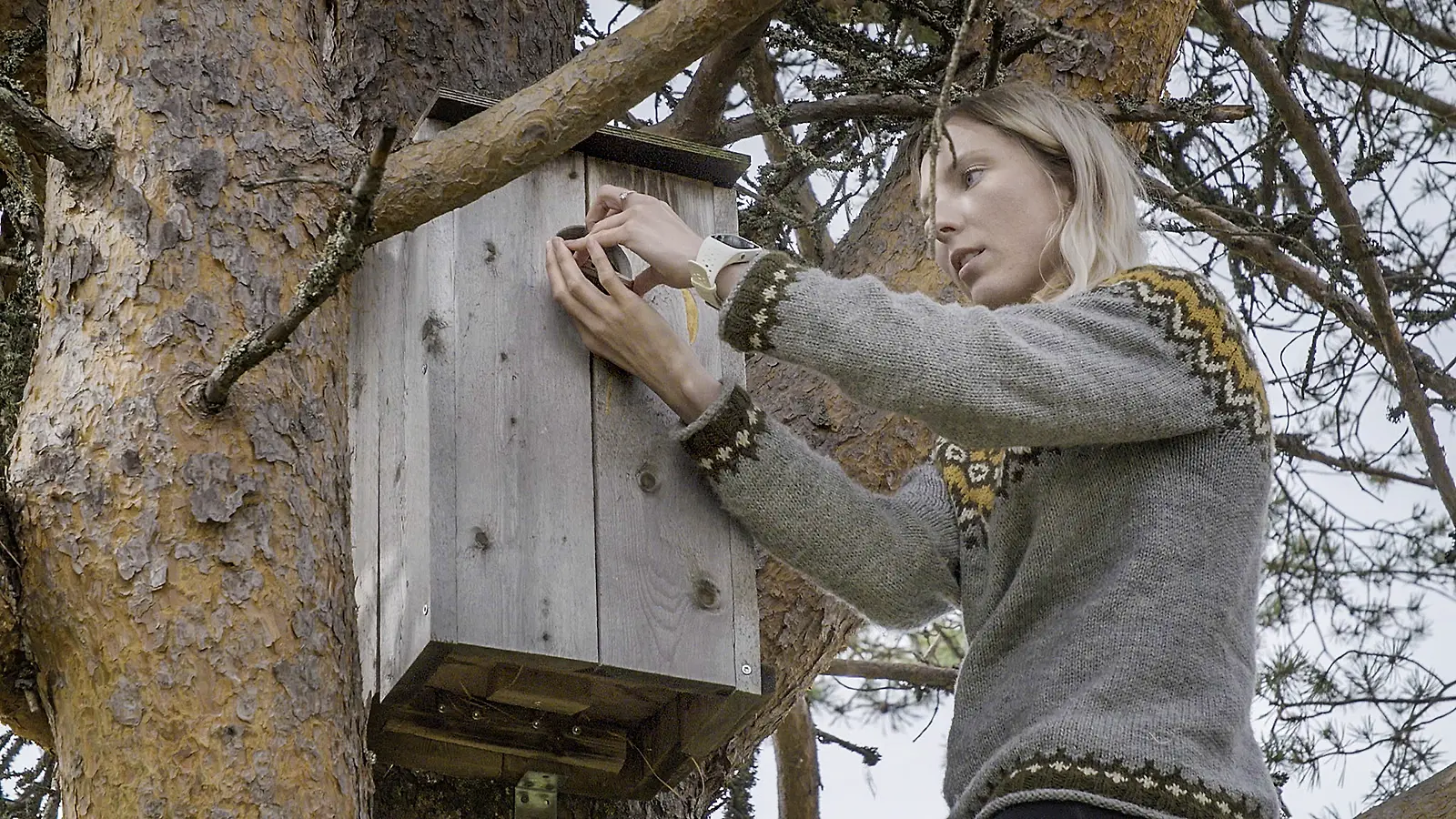 Marjo Kämäräinen tarkistaa kännykkäkameran kautta, onko linnunpöntössä käynyt myyriä. Kuva: NTRNZ media/Yle Yle Kuvapalvelu