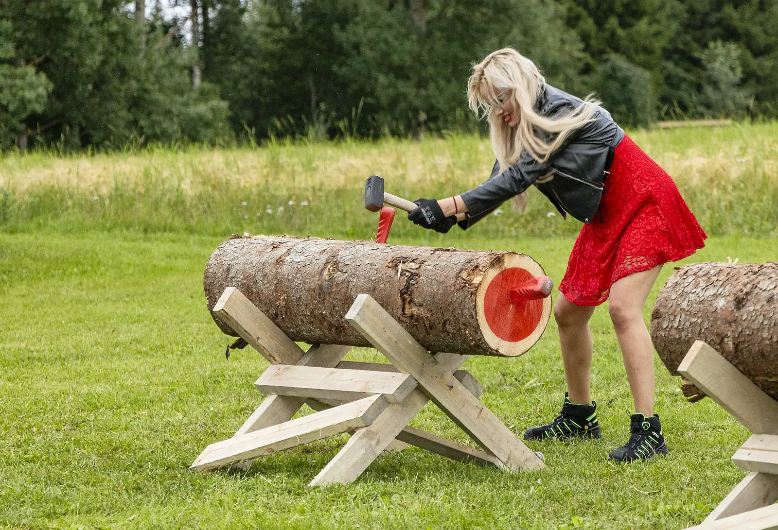 Vainio joutui moneen fyysiseen mittelöön Farmi Suomessa, tässä tukin halkaisuhommissa. Kuva Alpertti Rieskjärvi, Nelonen