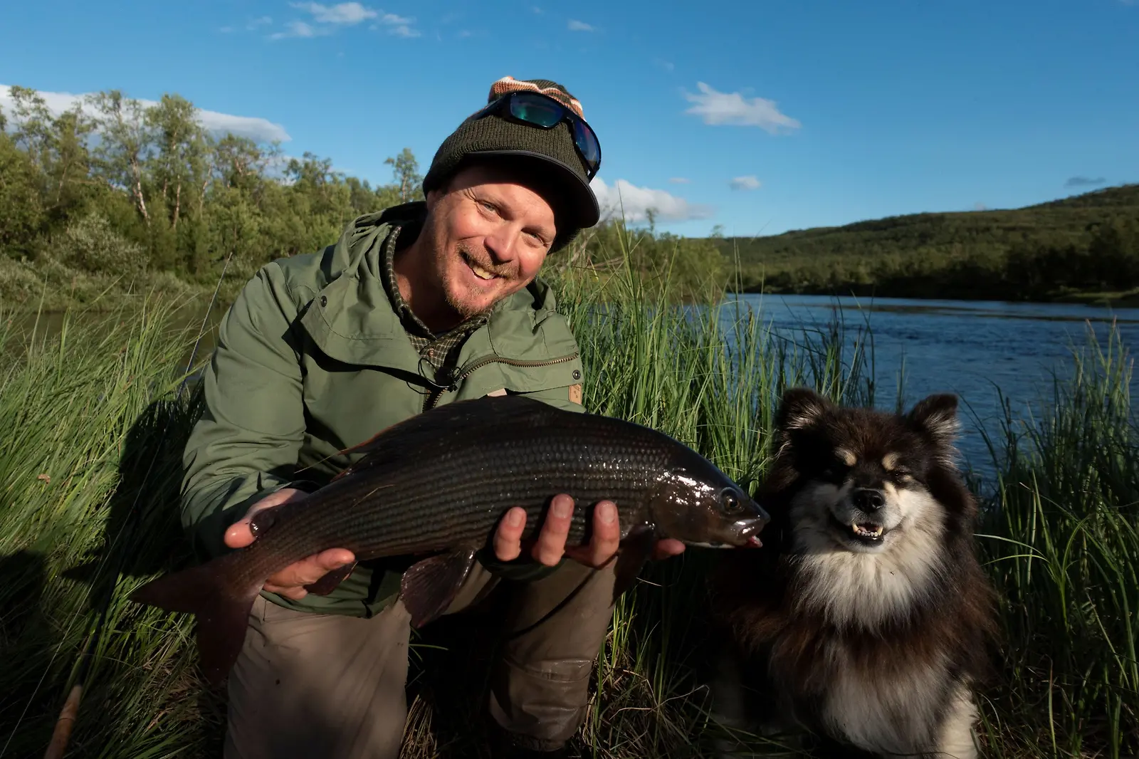Aki Huhtanen, Äijä-koira ja saaliiksi saatu harjus. Kuva:Eemeli Hepola / NTRNZ media Oy / Yle