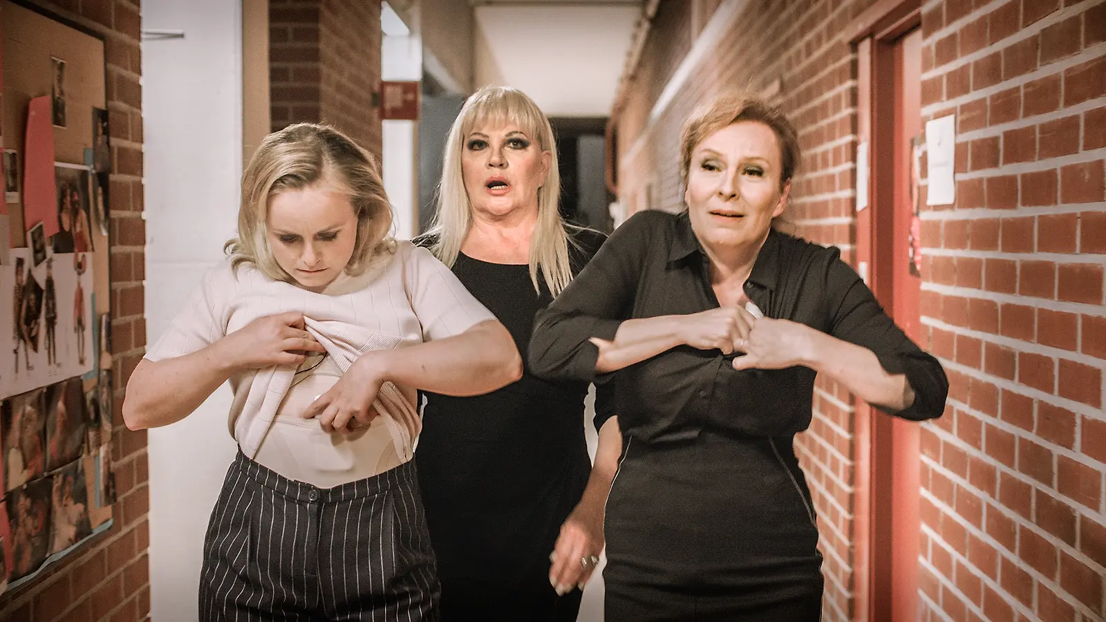 Emilia Sinisalo, Heli Sutela ja Hannele Lauri vievät katsojat teatterin kulissien taakse. Kuva: Yle Kuvapalvelu