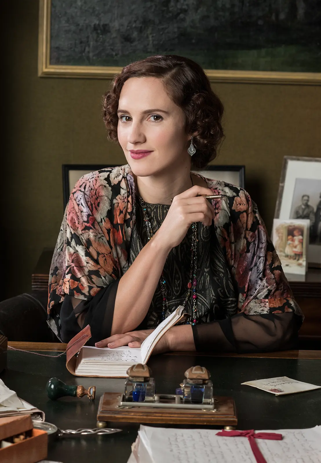 Kuvassa kirjailija työnsä äärellä - Agatha Christie (Ruth Bradley). Kuva: Helen Sloan/Yle