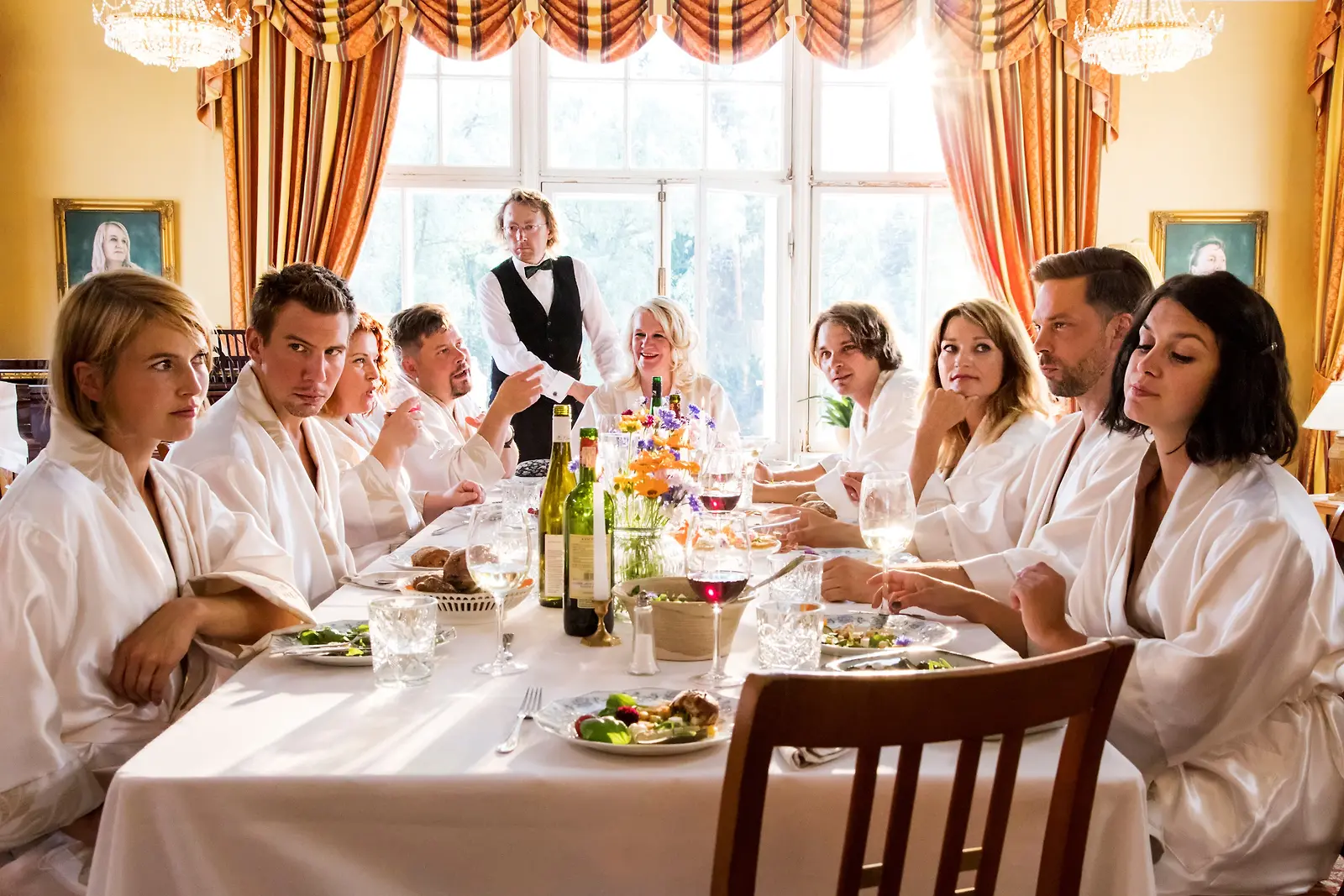 Swingersin tähdet: pöydän vasemmalla puolella vasemmalta oikealle Laura (Marja Salo), Ari (Aku Hirviniemi), Veera (Kiti Kokkonen) ja Jani (Janne Kataja). Pöydän oikealla puolella vasemmalta oikealle Jere (Roope Salminen), Inka (Matleena Kuusniemi), Esko (Mikko Nousiainen) ja Milla (Mimosa Willamo). Pöydän päässä Swingers-kartanon isäntäpari Eero (Tommi Liski) ja Ritva (Miitta Sorvali) / Kuva Jaana Rannikko © Bronson Club 2018.