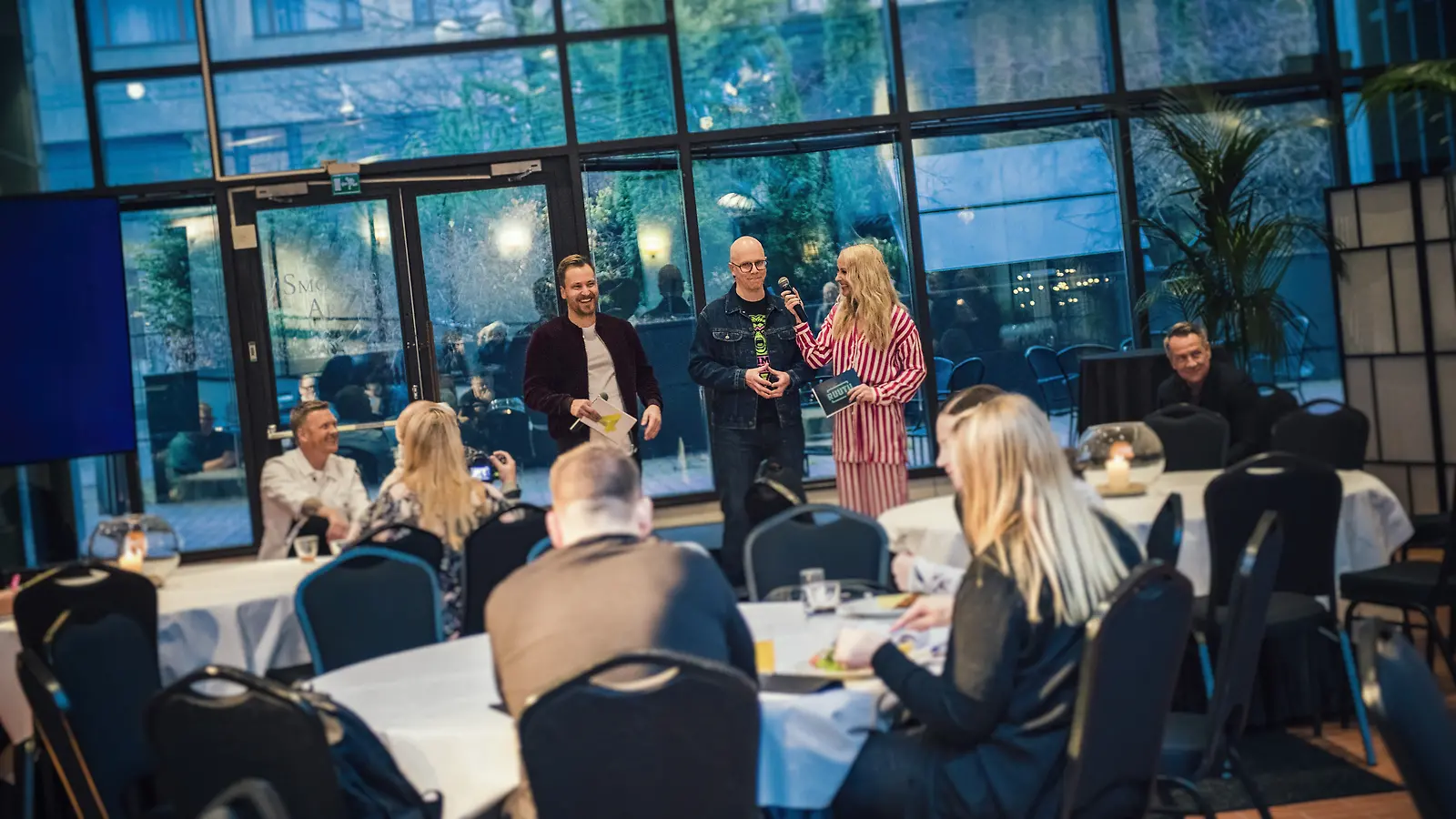 Heikki Paasonen ja Elina Kottonen grillasivat valmentajia lehtistötilaisuudessaa. Kuva: Nelonen Media, Petri Aho.