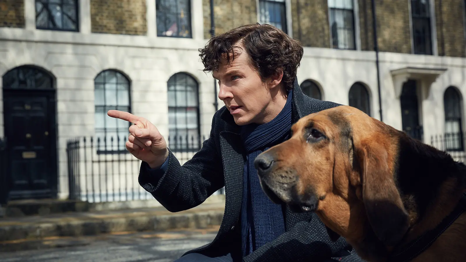Benedict Cumberbatch ja vainukoira tositoimissa Uusi Sherlock-sarjassa. Kuva: Robert Viglasky / Hartswood Films / BBC Studios Distribution Limited / Yle