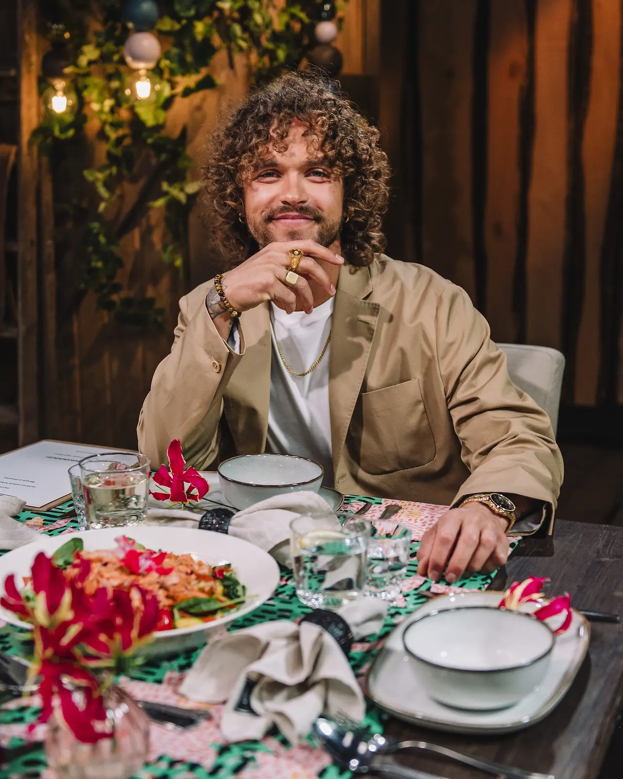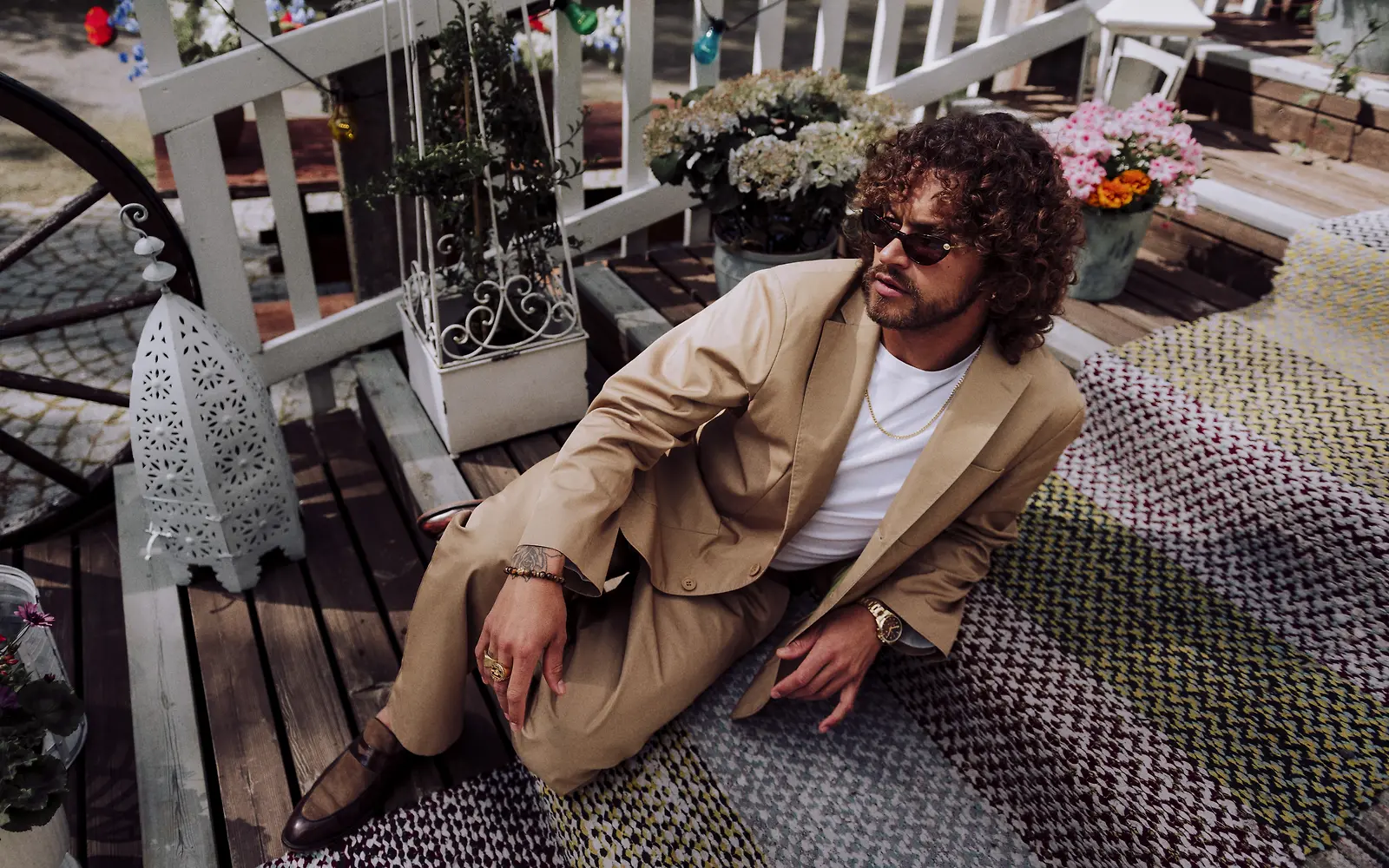 Pete Parkkonen taitaa eri tyylit, tässä beigessä puvussa ja tv-paidassa. Kuva: Nelonen