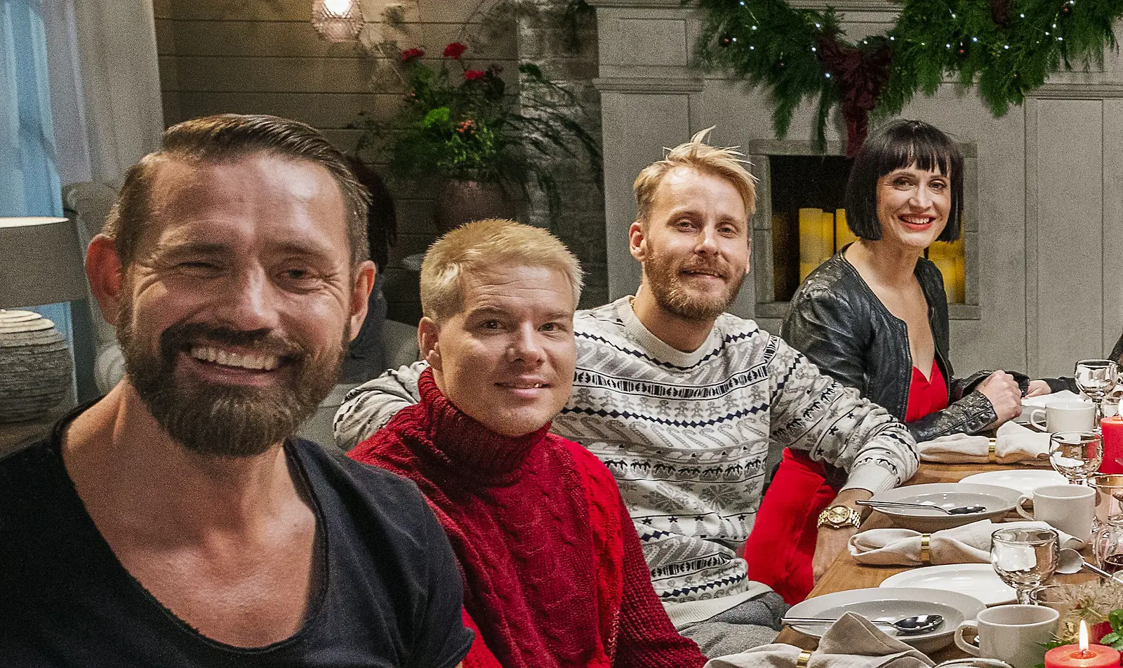 VilleGalle ja Jare joulupöydässä Lauri Tähkän ja Maija Vilkkumaan välissä. Kuva: Nelonen