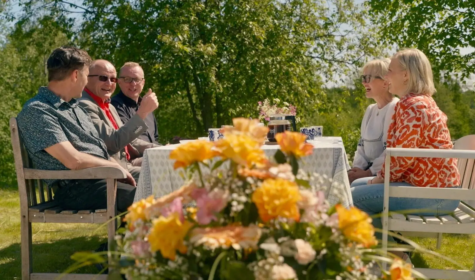 Tarja kutsui mansikkatilalleen kolme miestä, Juhan, Ismon ja Ramin. Oikealla Tarja ja Vappu Pimiä. Kuva: MTV3