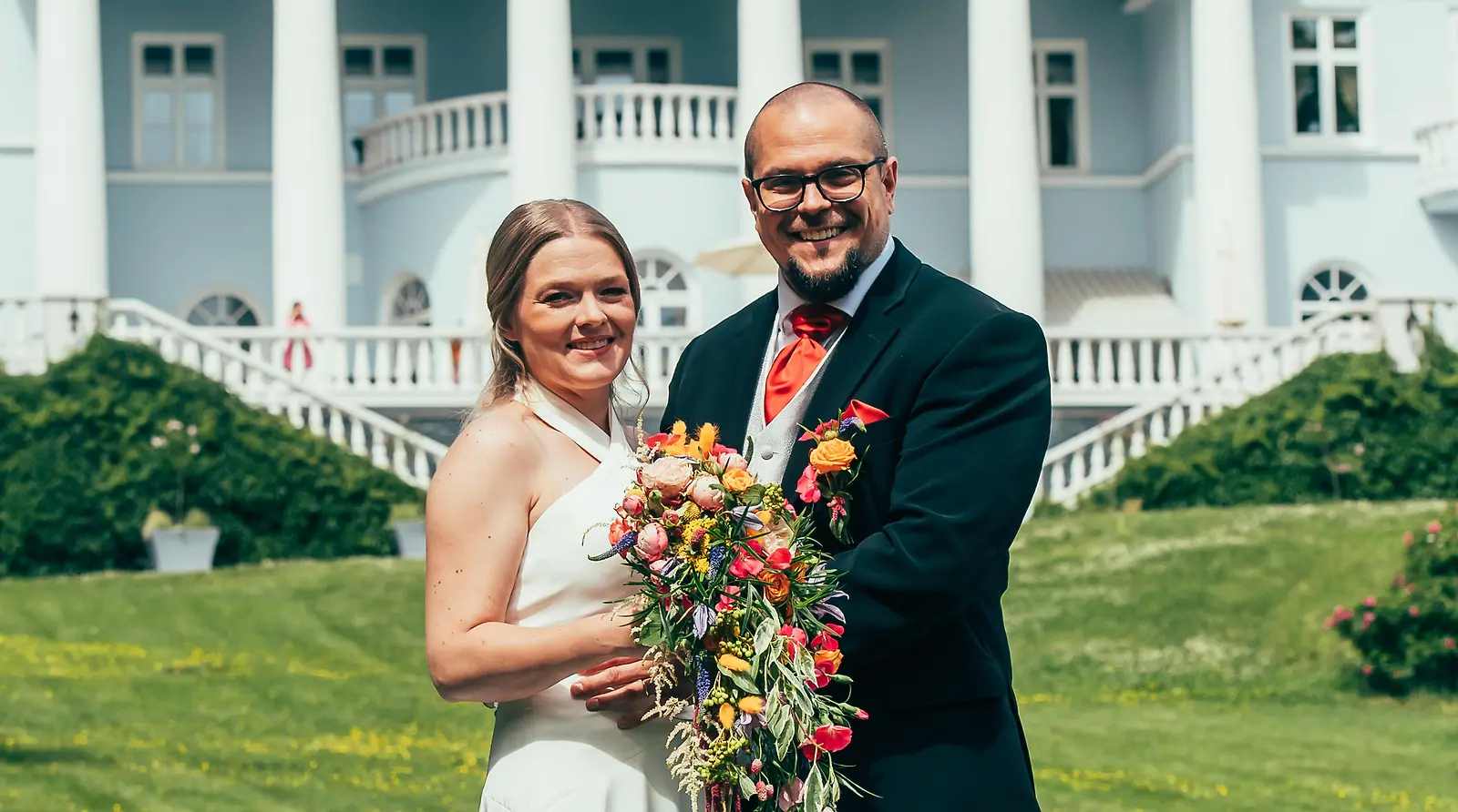 Tiia ja Petri astelevat vieraiden taputtaessa hääpaikalta alas puutarhaan valokuvausta varten. Kuva: MTV3