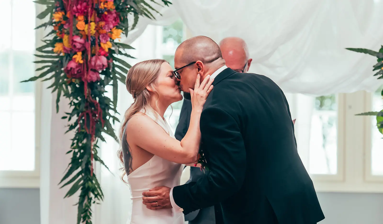 Seremonian jälkeen Tiia ja Petri vaihtavat suudelman. Kuva: MTV3