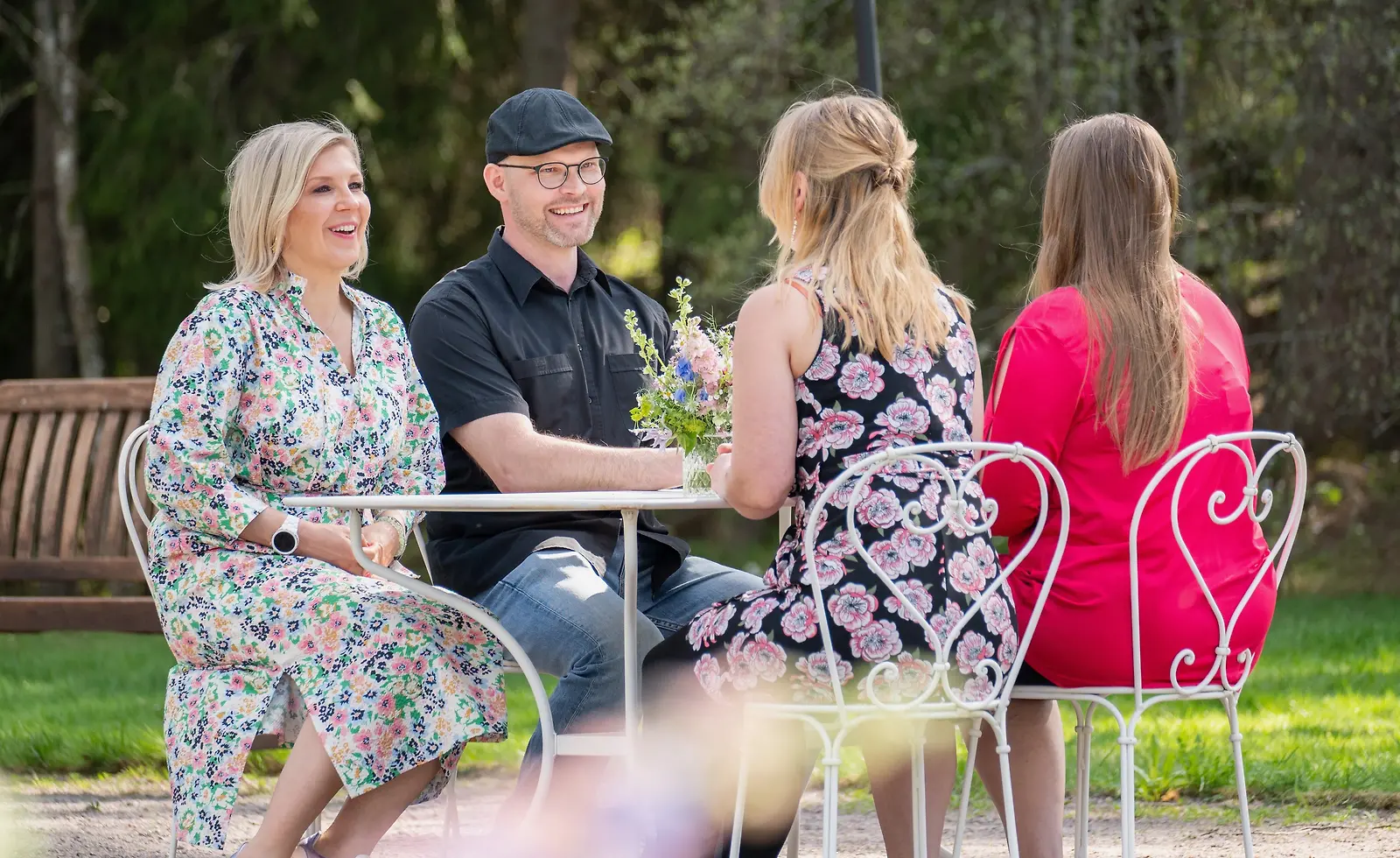 Maajussi-Harri, Vappu Pimiä ja morsioehdokkaat Jonna ja Taru ovat istahtaneet ulkona pöydän ääreen. Harri kertoo kokemuksen olleen intensiivinen ja uusi sekä aivan valtavan suuri ponnistus.