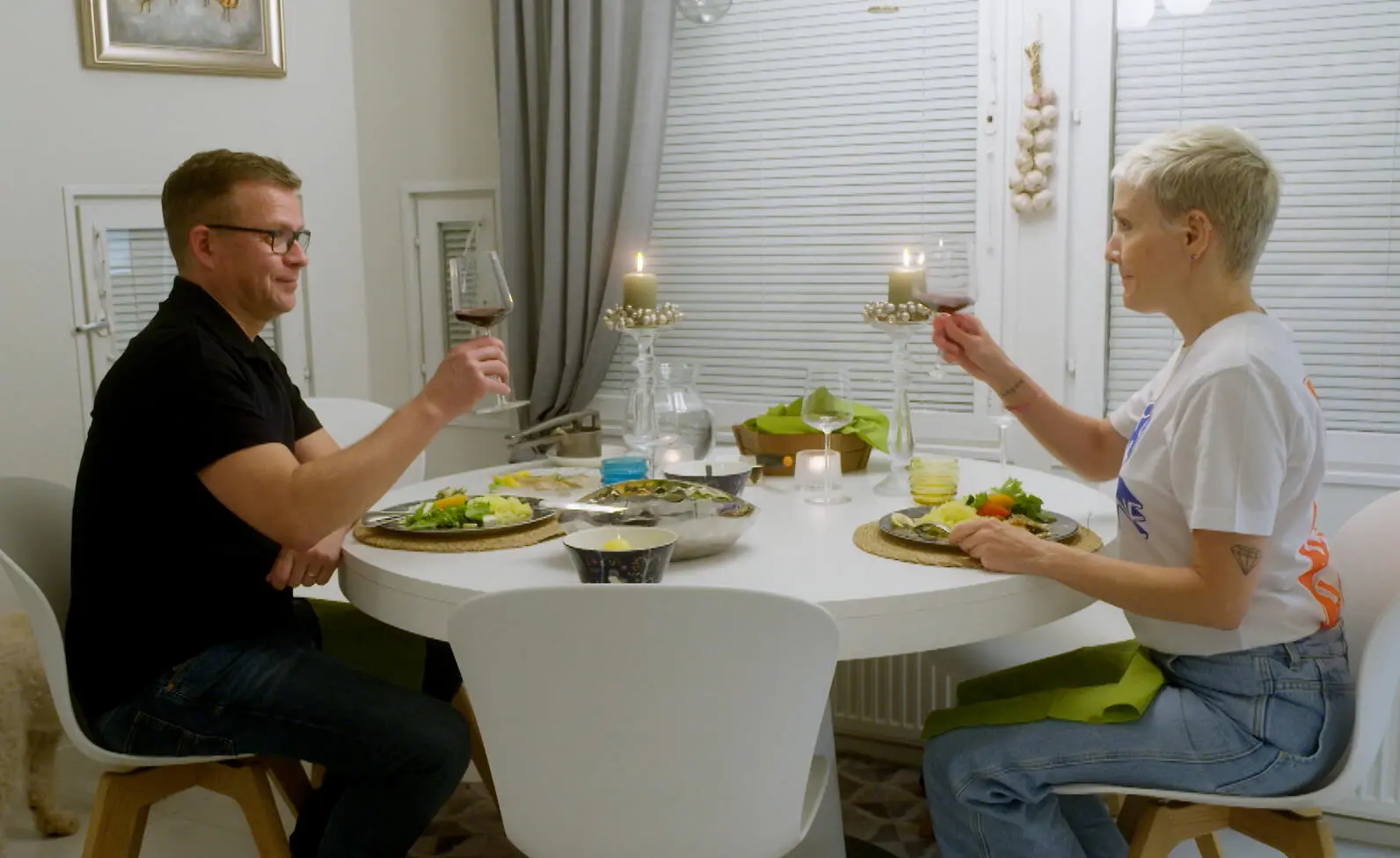 Orpo ja Veitola söivät yhdessä illallista viinilasillisen ääressä. Kuva: MTV3